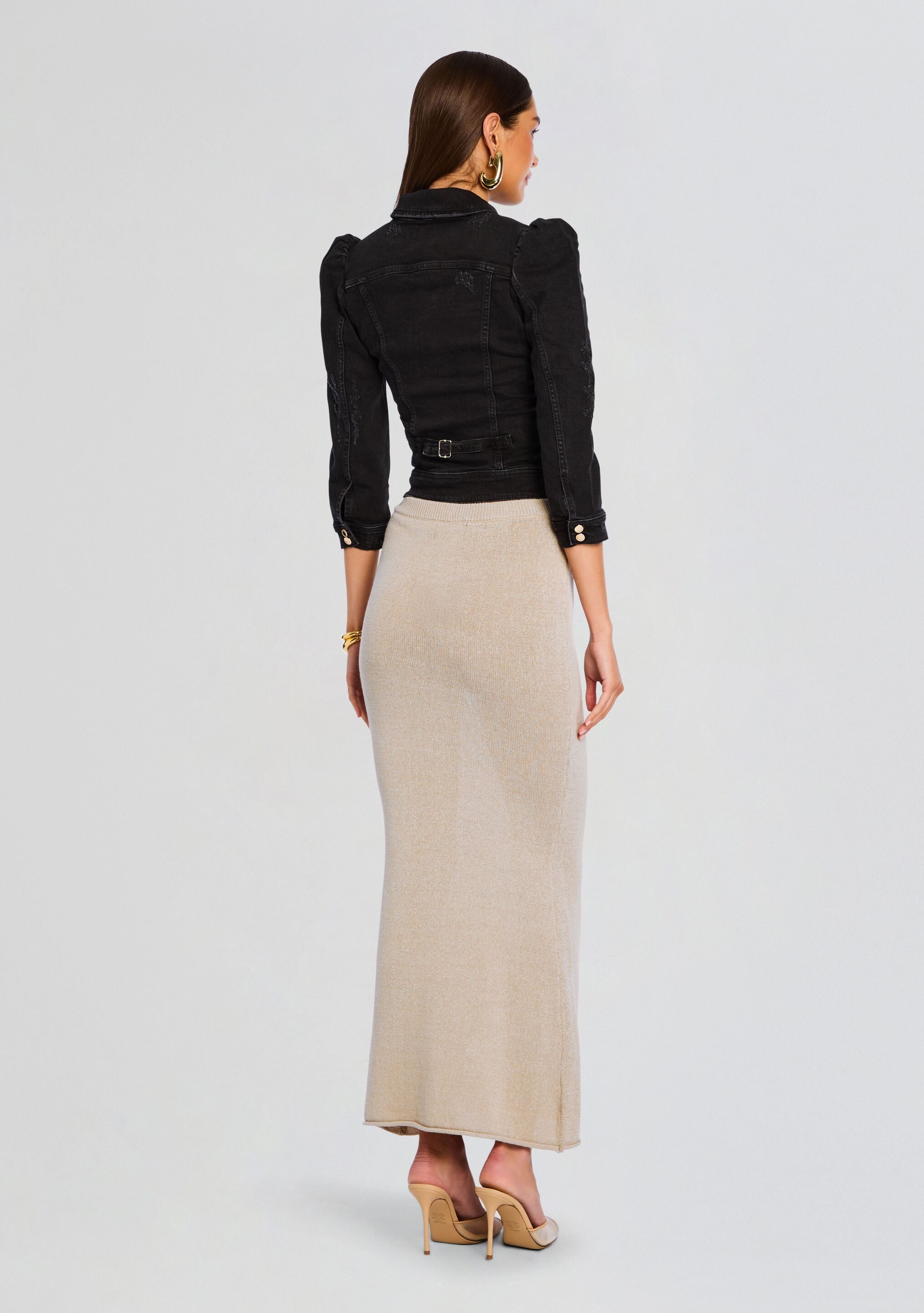 The Ada Jacket is an everyday Retrofête staple. A chic twist on a classic wardrobe essential. the denim jacket features puffed cropped sleeves and a cinched back for a tailored fit. Shown here in True Black.