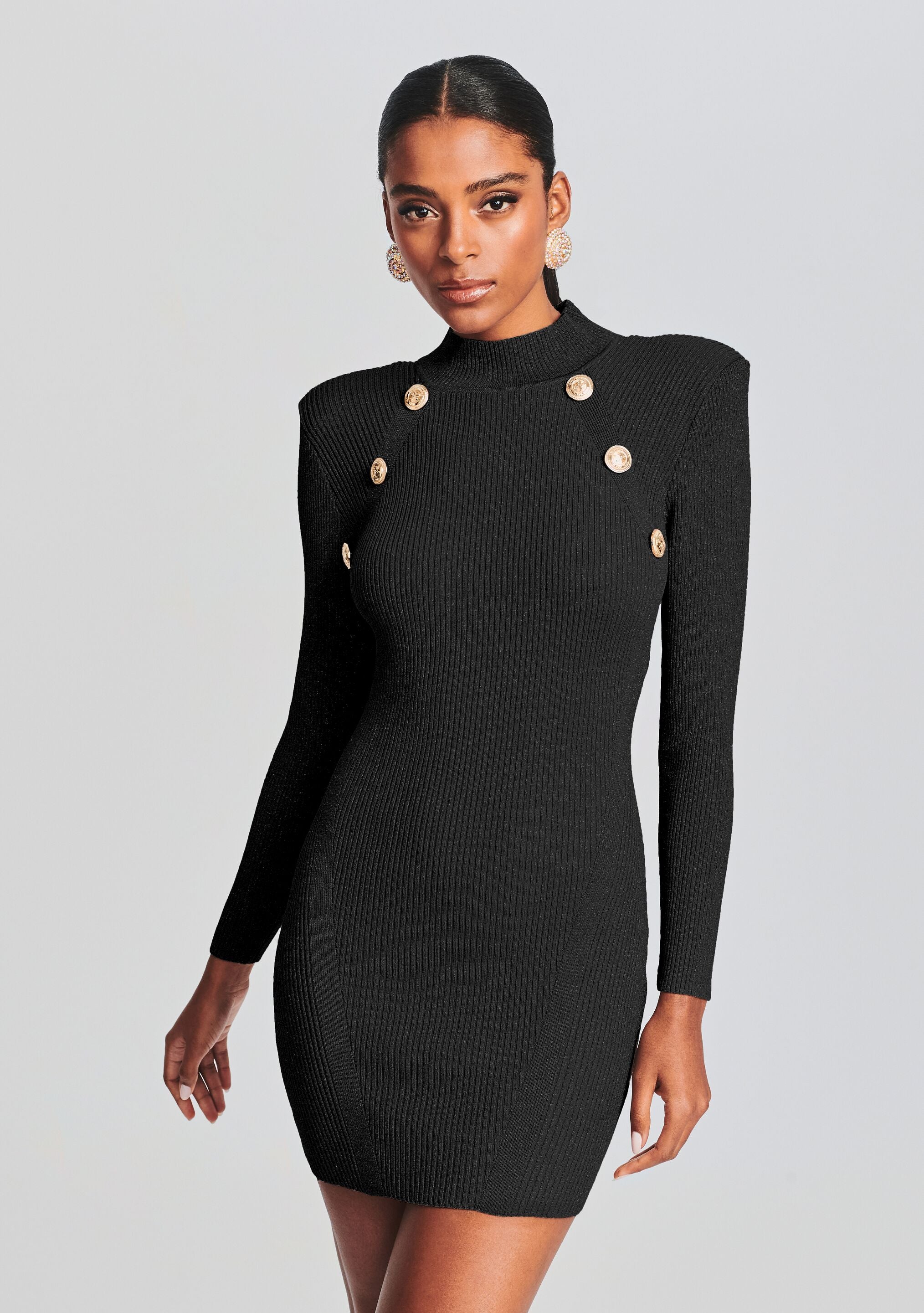 Radiate style in our Aislinn Dress. This long sleeve knit dress features a mock neckline and shoulder pads. Carefully placed golden button arrangements make for the perfect final touch. Shown here in Metallic Black.