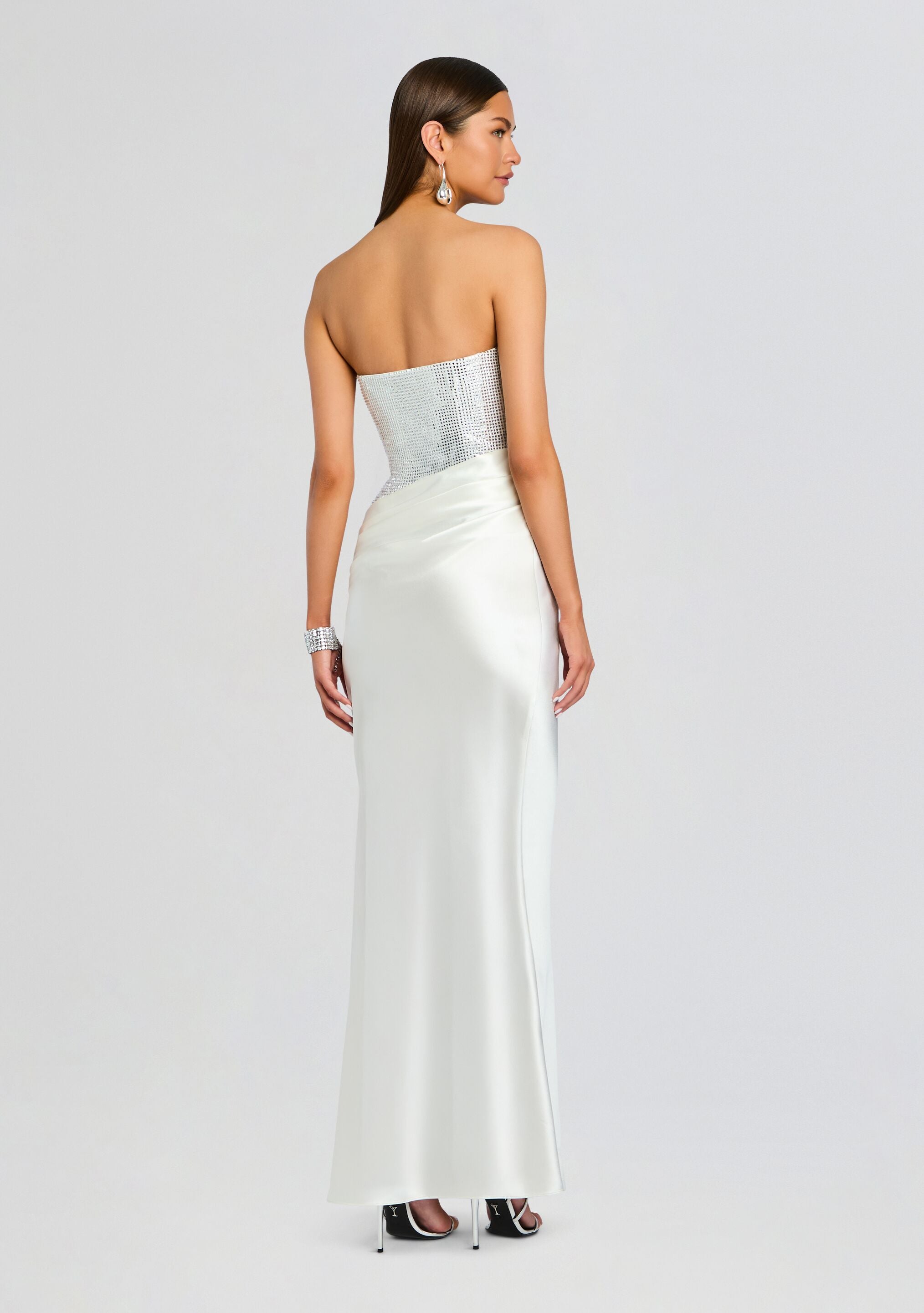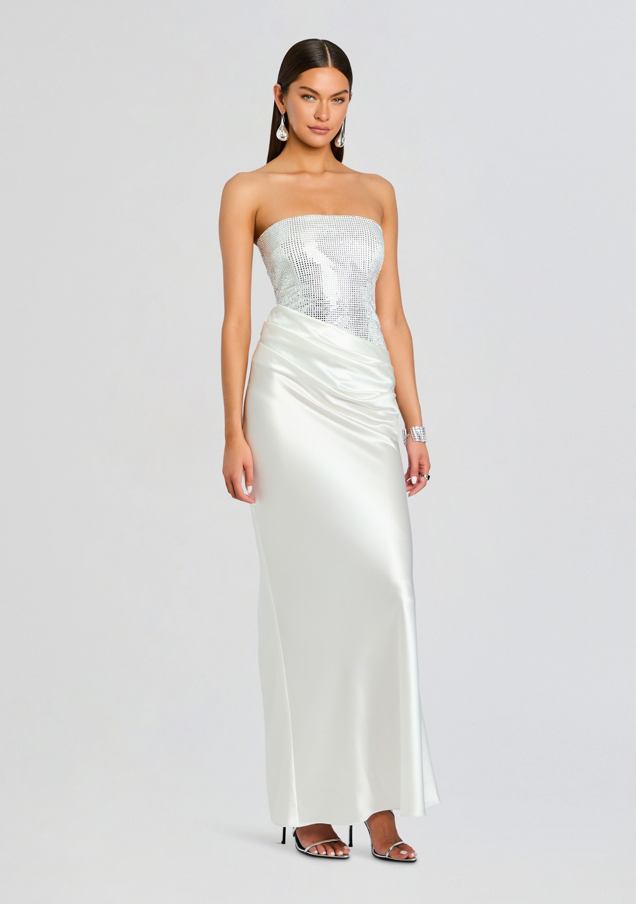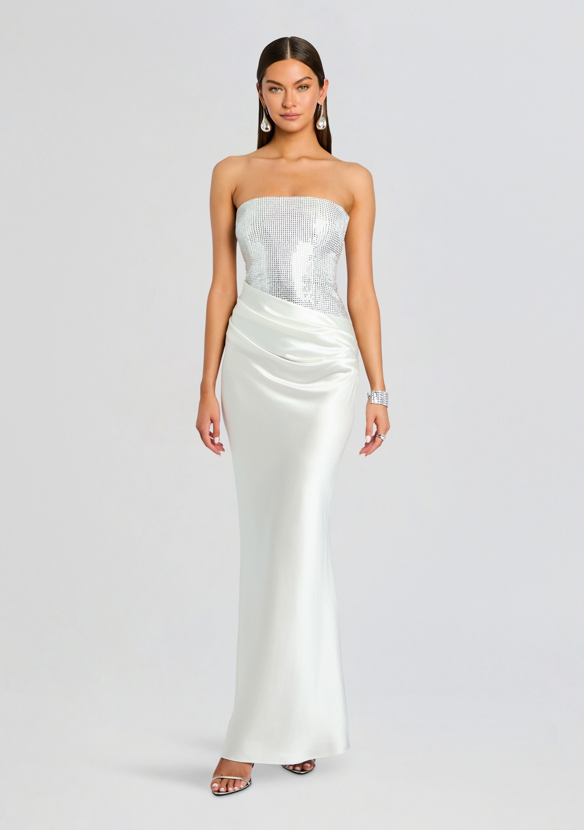 The Alexandra Dress embodies timeless allure with its sleek strapless silhouette and rich satin construction. Delicately adorned with sequins. it strikes the perfect balance of glamour and poise. Shown here in White/Silver.
