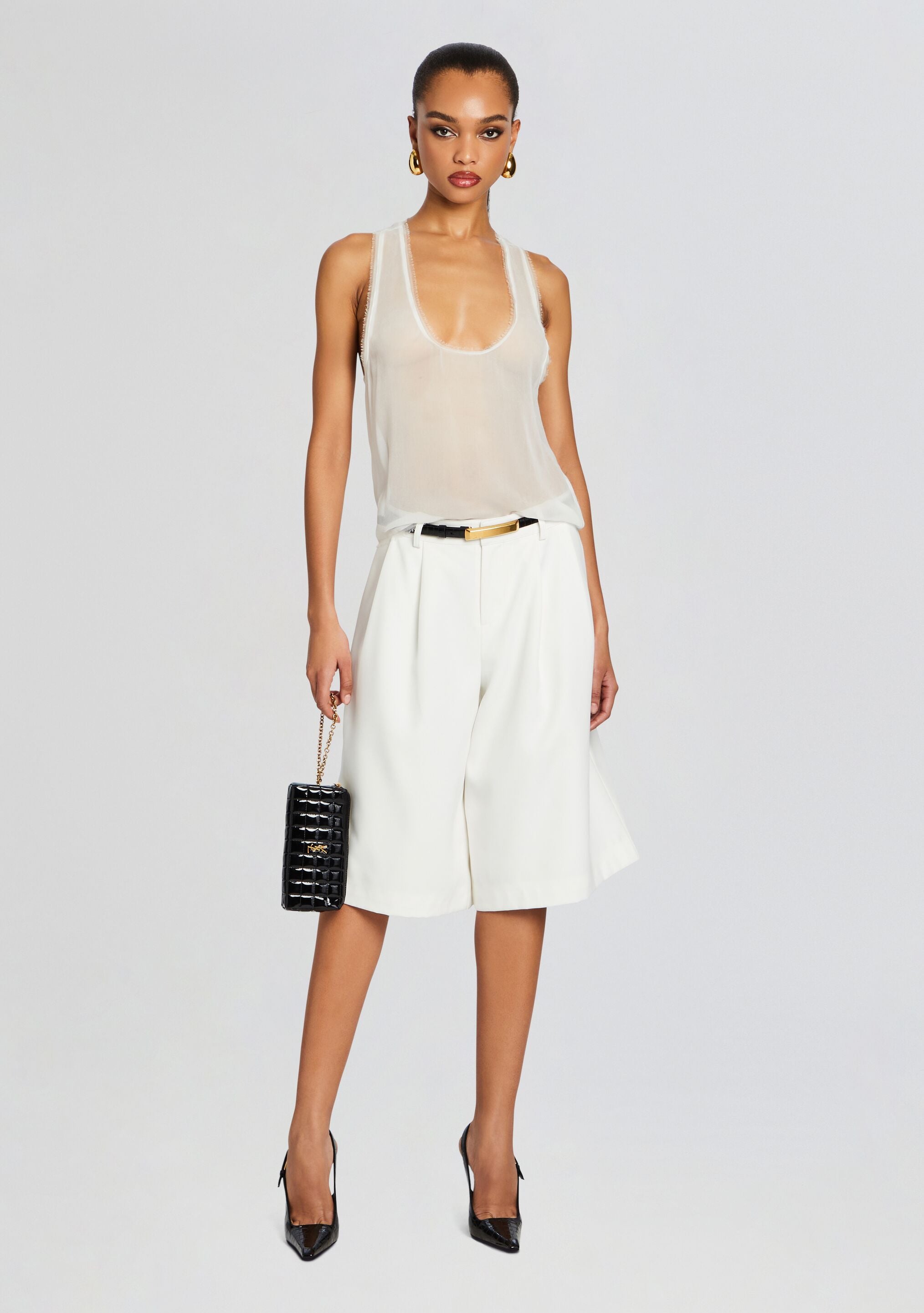Indulge in a combination of elegance and edge with our Alyson Short. These shorts offer a chic and classy silhouette with just the right amount of edge to make a statement. Whether you're sipping cocktails at a rooftop bar or strolling along the city streets. our Alyson Short effortlessly transitions from day to night. The low-waisted design adds a touch of casual sophistication. while the longer length provides both comfort and style. Shown here in White.