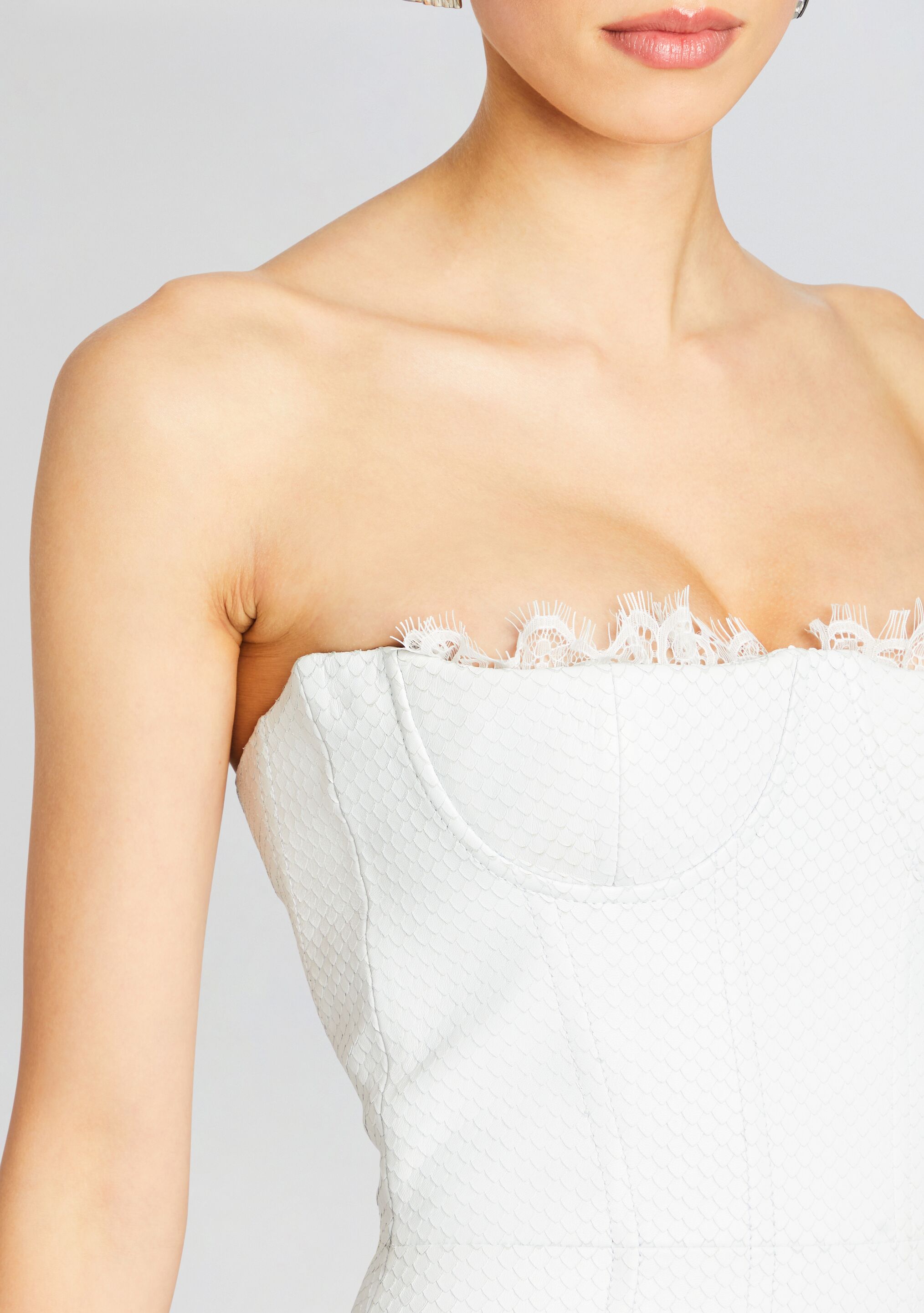 The Amberly Dress is a strapless stunner designed to enhance your confidence while turning heads with its unique reptile leather texture. ultra flattering fit and alluring lace accents. Shown here in White.