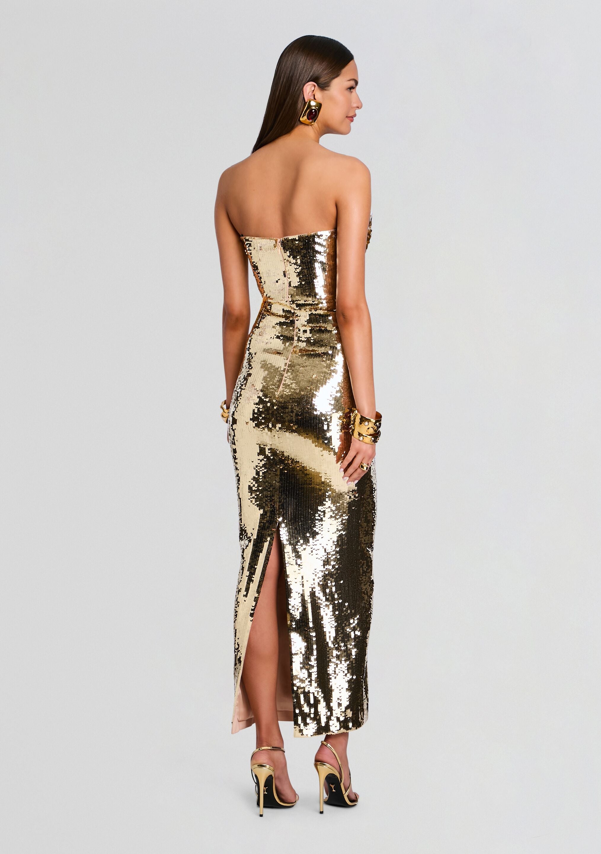 The Amulet Embellished Dress is a column gown with a dramatic plunging neckline and an embellished floral detail at the chest. Finished with a hidden back zipper. it's designed for galas and formal celebrations with refined elegance. Shown here in Gold.
