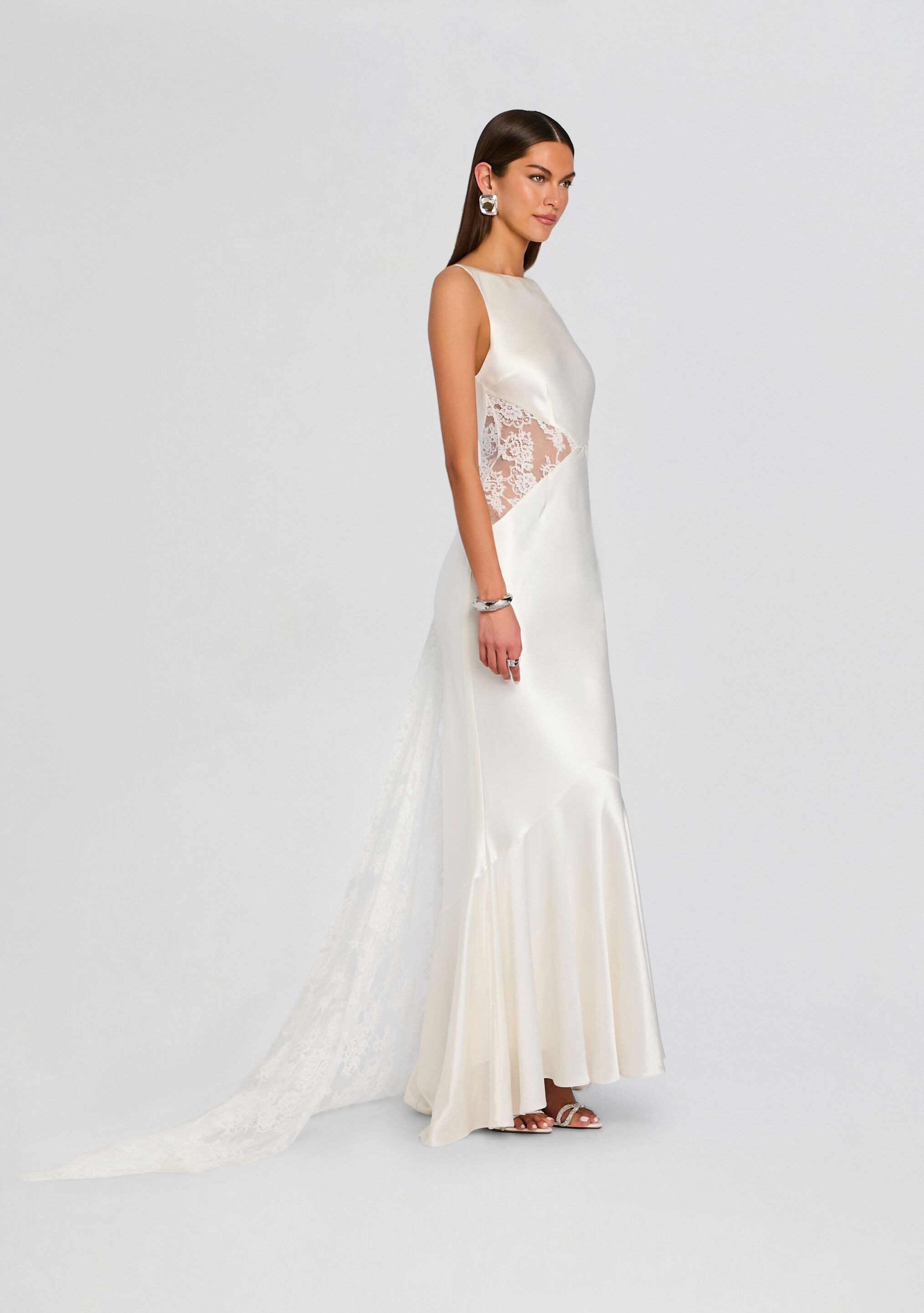 The Analuisa Dress is a sophisticated gown designed with a refined boatneck and a graceful open back. Delicate lace panels at the waist create a cinched silhouette while adding dimension. A removable train adds versatility and drama for the ceremony and beyond. Balancing clean lines with romantic detail. this gown is perfect for the modern bride seeking timeless elegance. Shown here in Ivory.