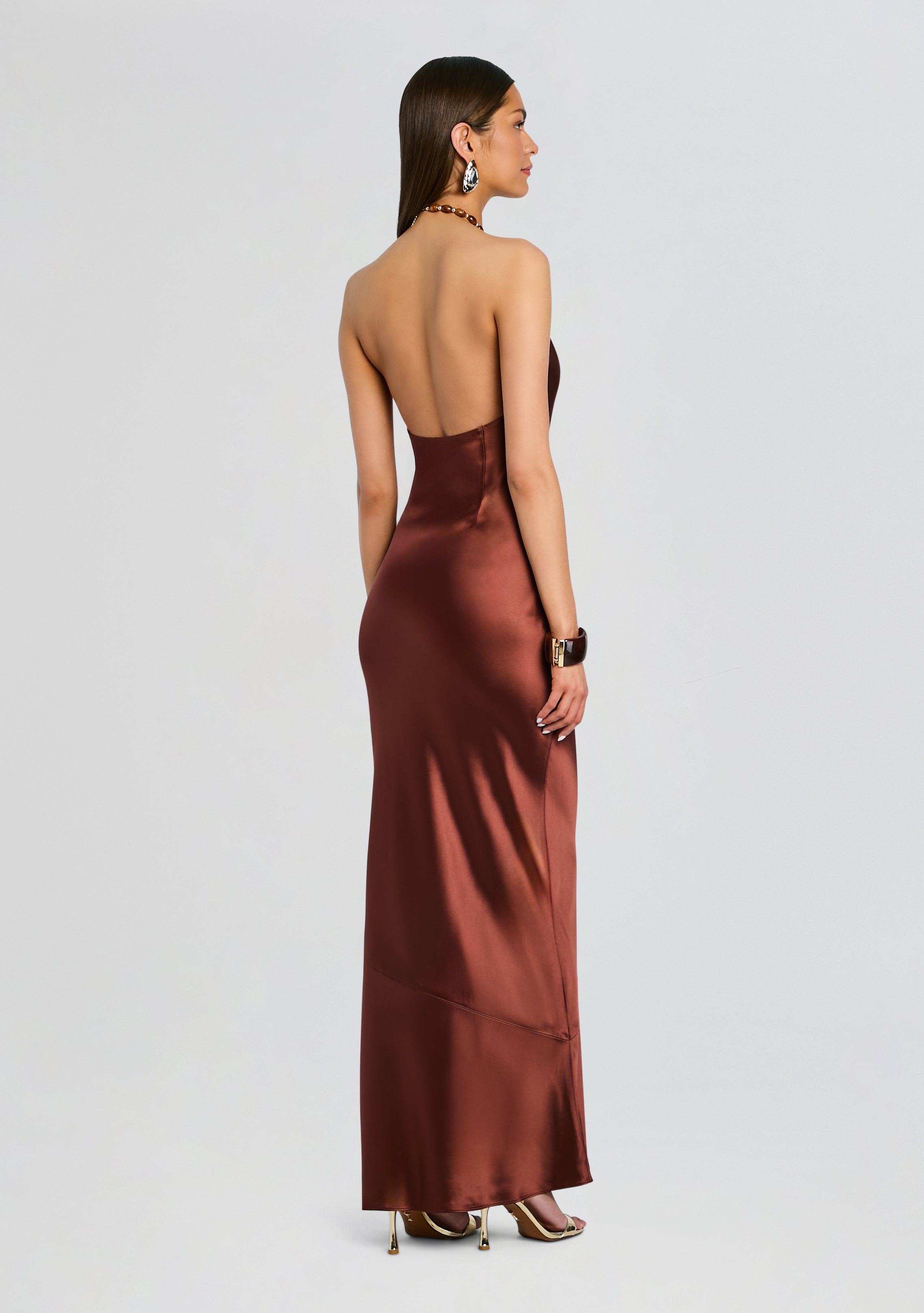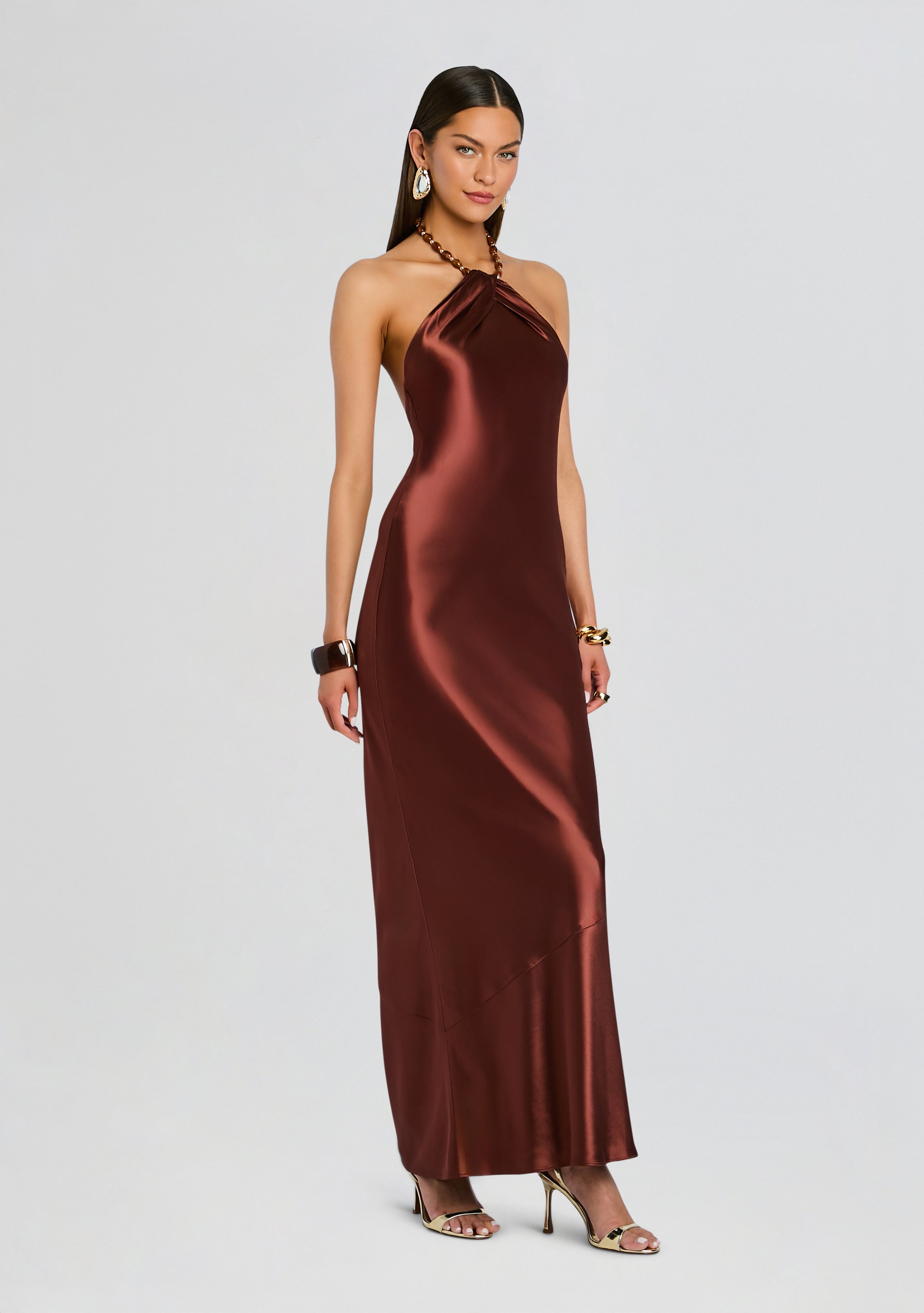 The Anat Dress is a satin gown designed for warm weather occasions. The dress features a halter neckline with a twist detail and a beaded necklace with clasp closure. Perfect for resort settings. vacations. or as a guest outfit. this dress combines luxe fabric and contemporary design. Shown here in Chestnut.