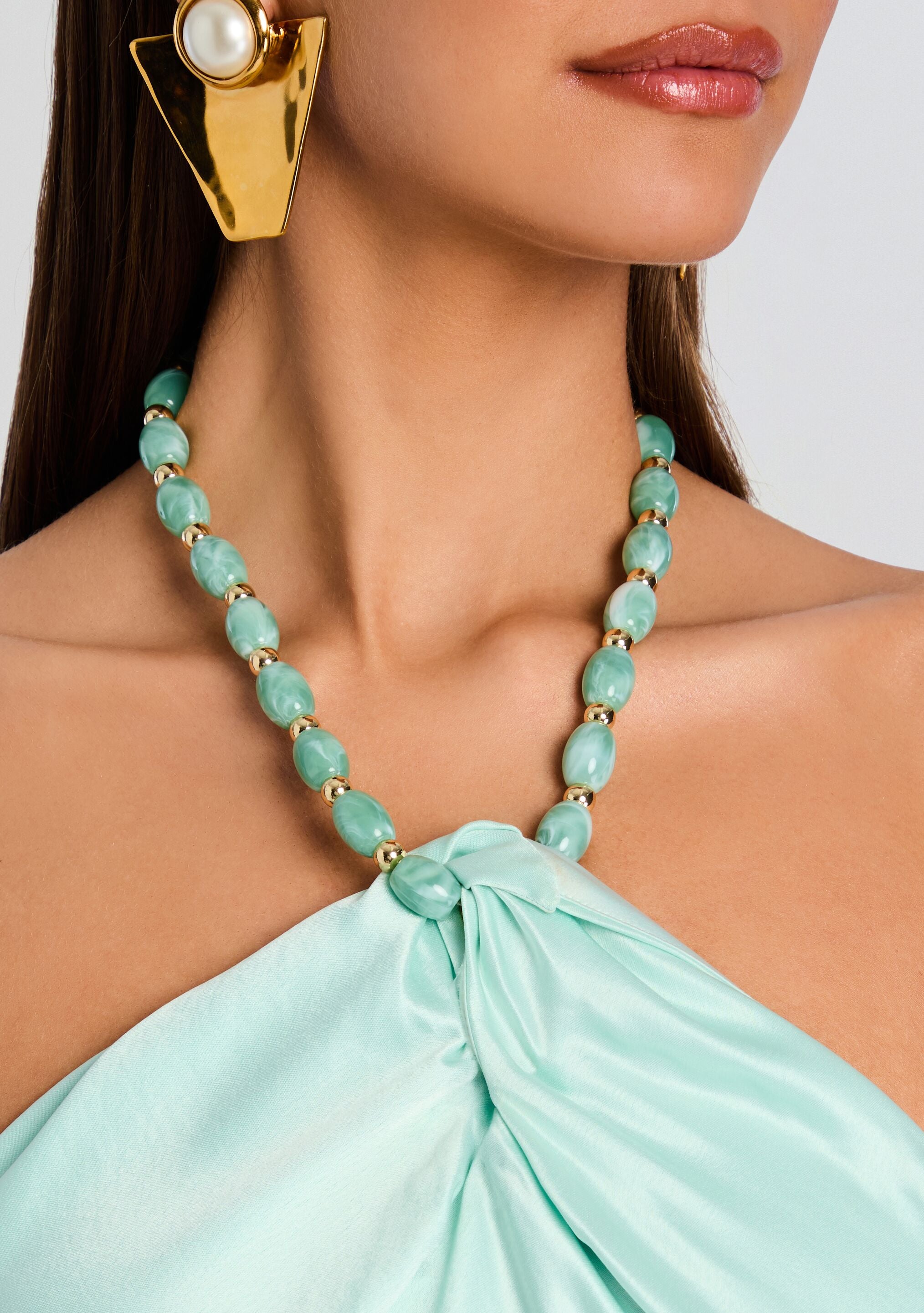 The Anat Dress is a satin gown designed for warm weather occasions. The dress features a halter neckline with a twist detail and a beaded necklace with clasp closure. Perfect for resort settings. vacations. or as a guest outfit. this dress combines luxe fabric and contemporary design. Shown here in Eucalyptus.