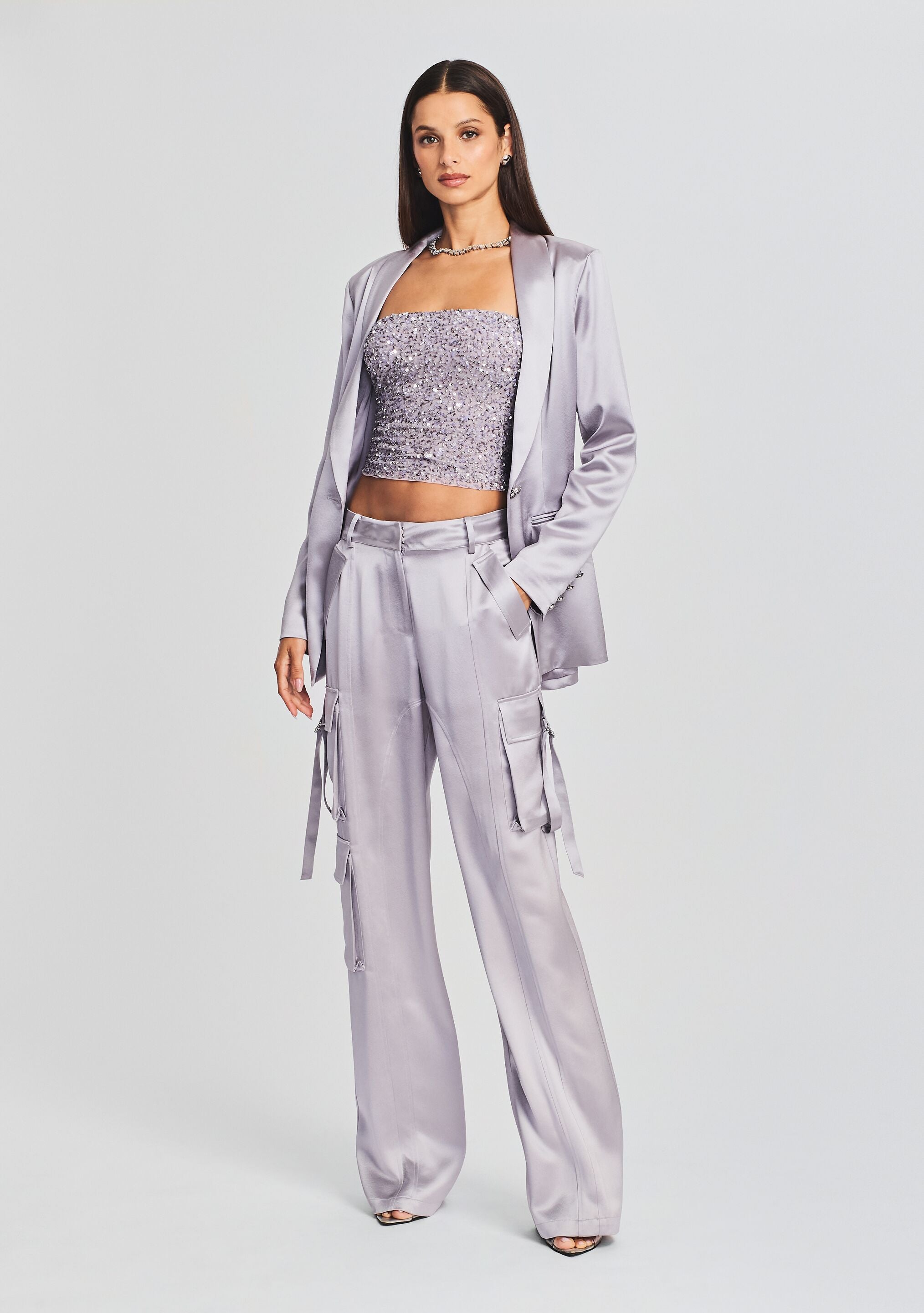 The André Pant is a glamorous twist to the on-trend cargo pant. Our version features the utilitarian details—side pockets and a wide leg—reimagined in a silky fabrication. perfect for going out. Shown here in Mink Grey.