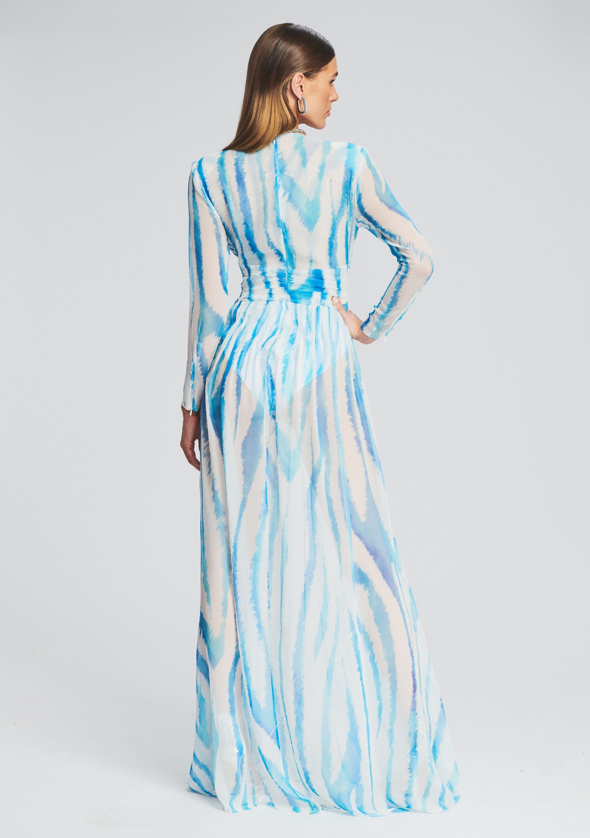 Command attention in the Angela Dress. Cut in sheer zebra printed silk. the flowy design amps up the drama with a built-in bodysuit and a deep slit down the front. The style is finished with an invisible zip closure. For a more relaxed look. wear it with a pant or a short. Shown here in Blue Zebra.