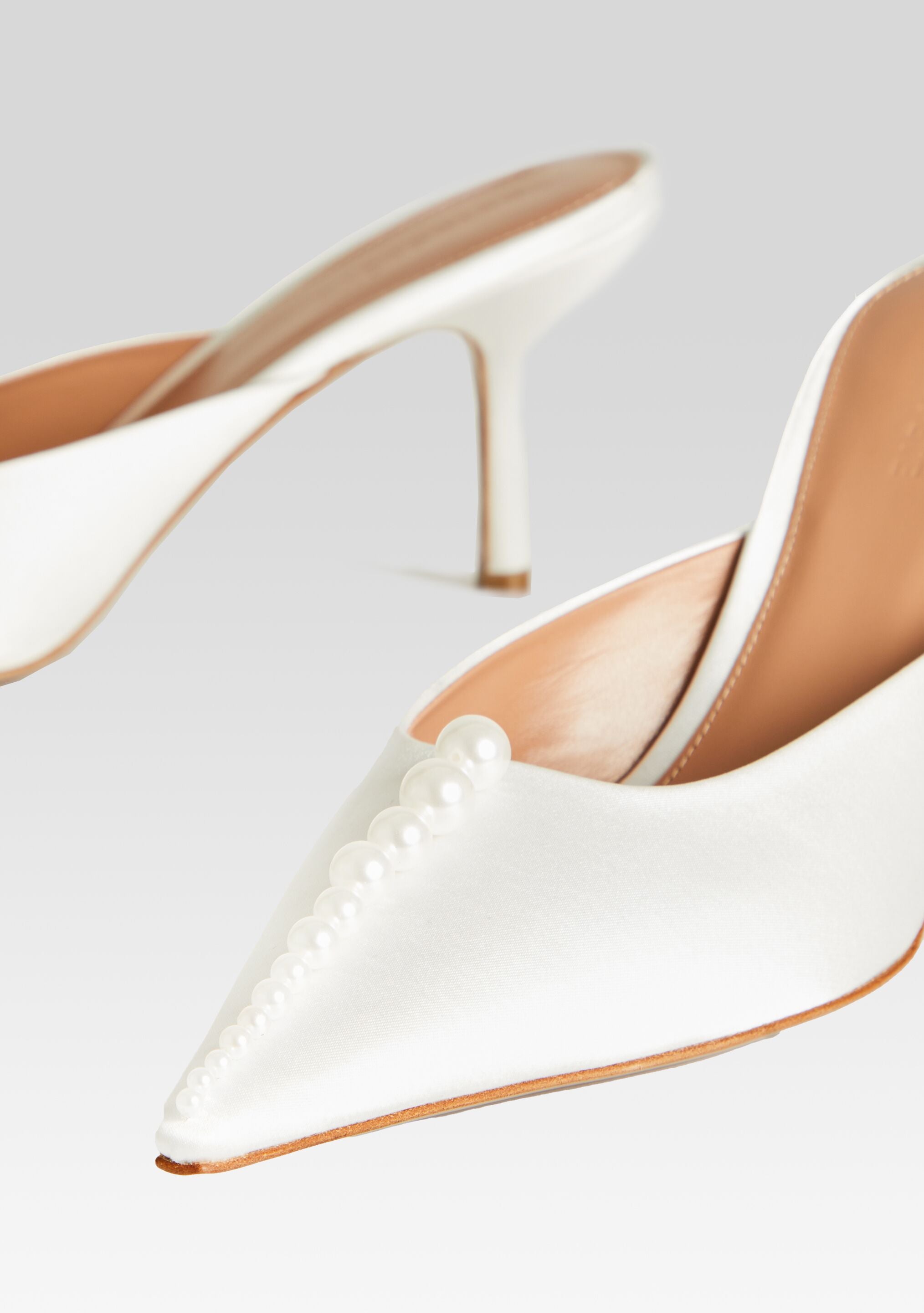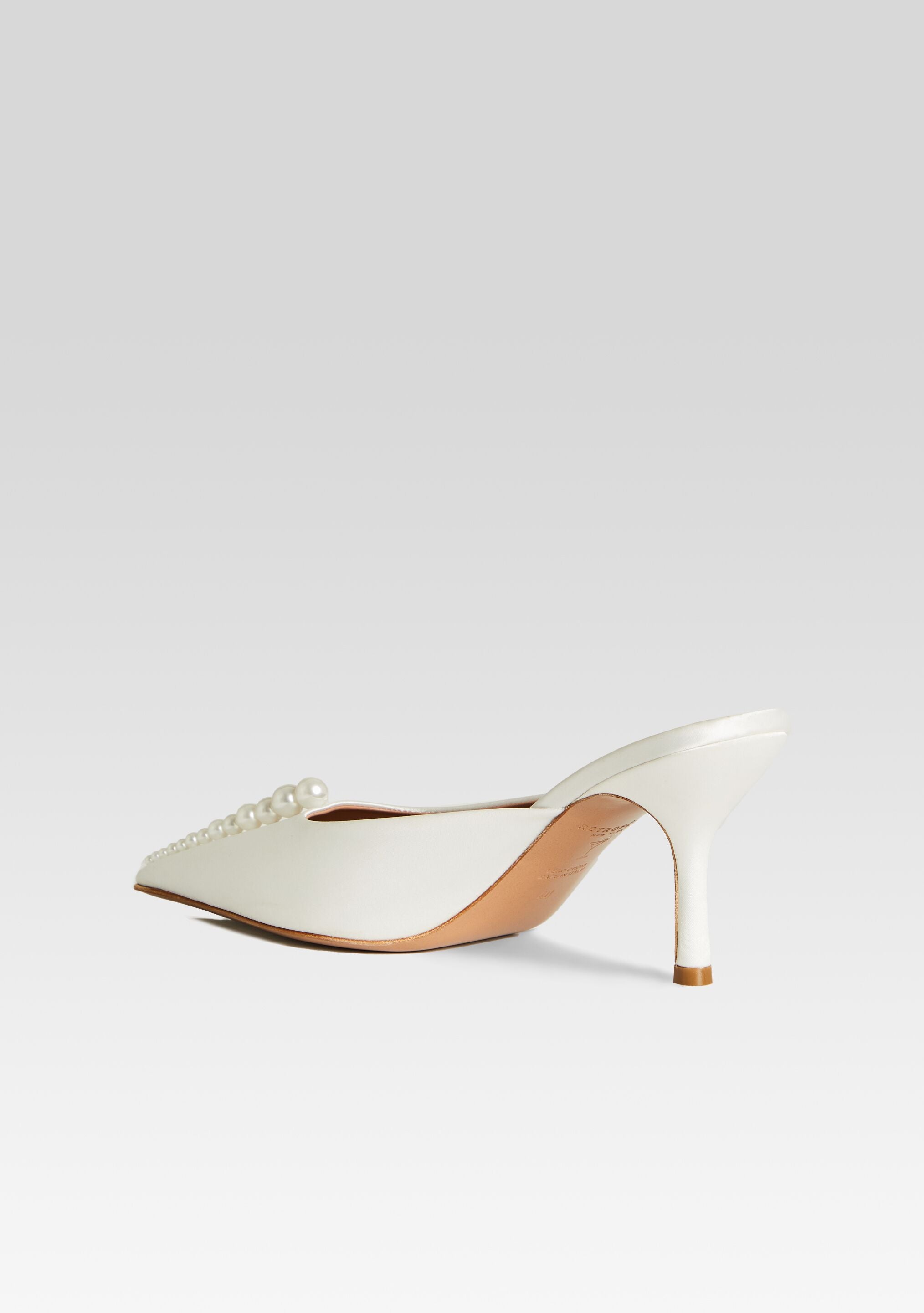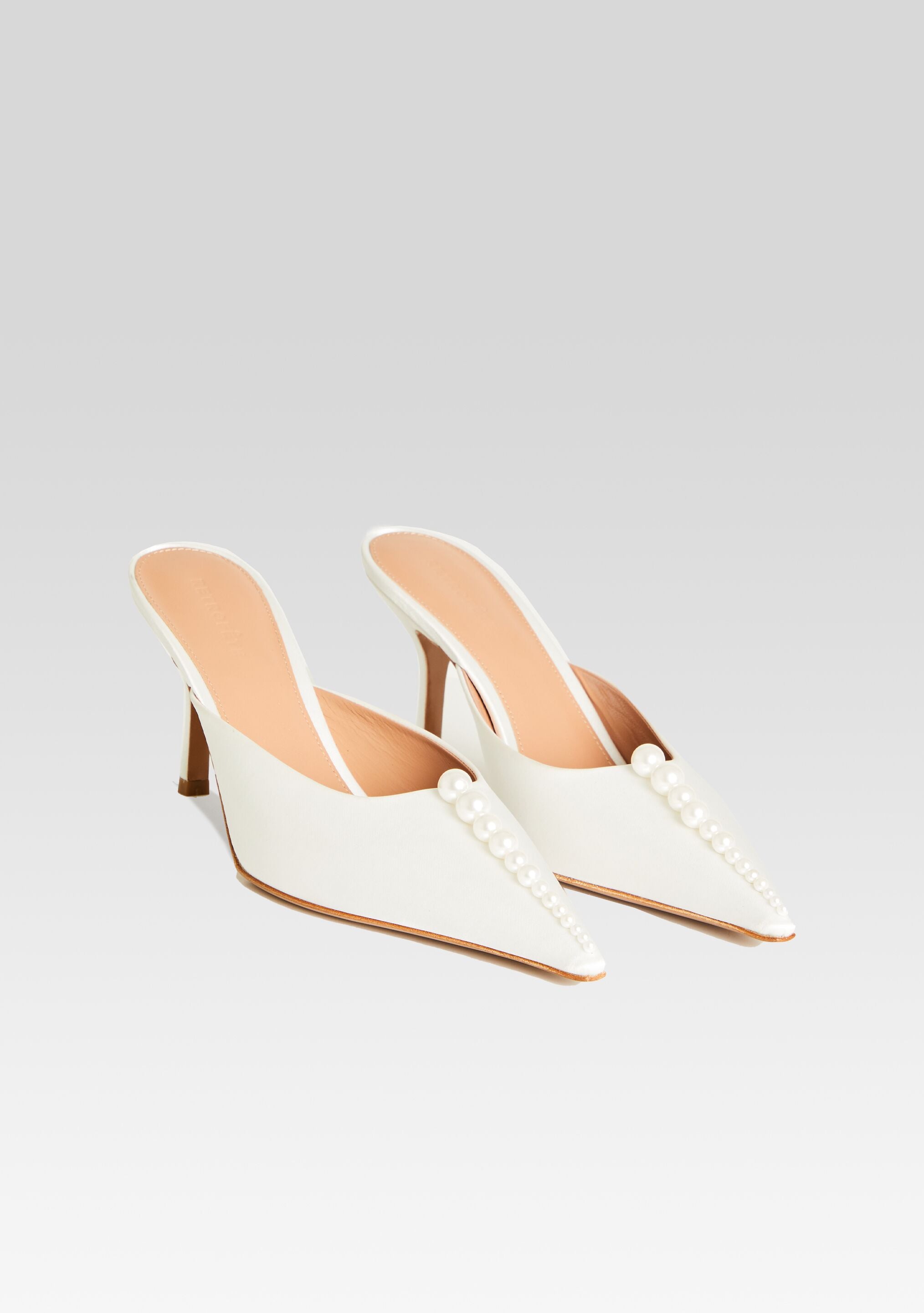 Effortlessly chic. our Ariel Mule combines modern design with classic elegance. Luxurious white leather is adorned with a row of lustrous pearls. creating a sophisticated and versatile shoe for any occasion. Shown here in White.