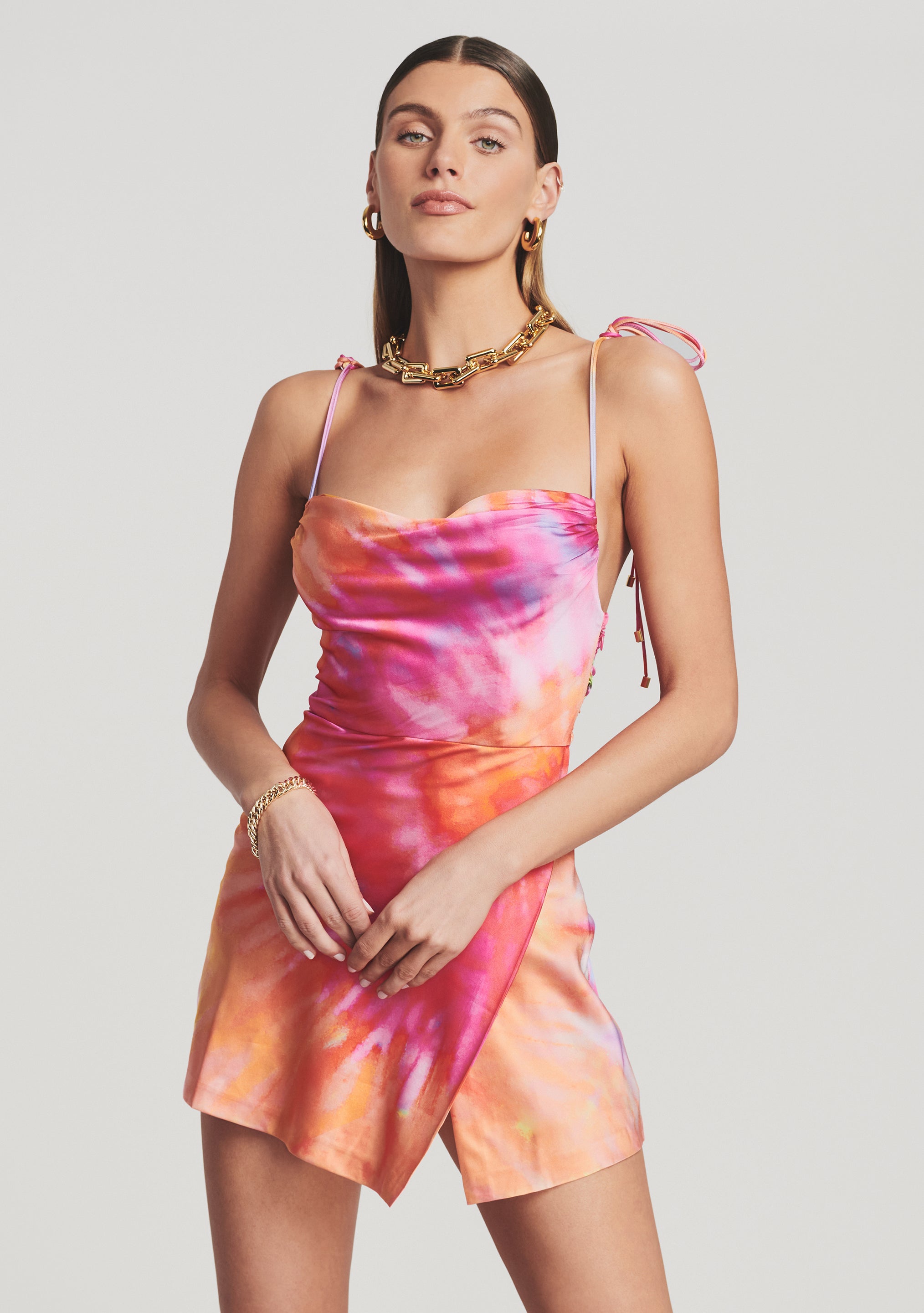 Slip into our Ariella Dress. an airy silk mini dress that is both feminine and Glamorous. Designed with an overlapping panel on the front. the slip-style silhouette boasts a vibrant sunset print. The style features a draped cowl neckline. barely-there straps and an invisible side zip closure. Shown here in Sunset.