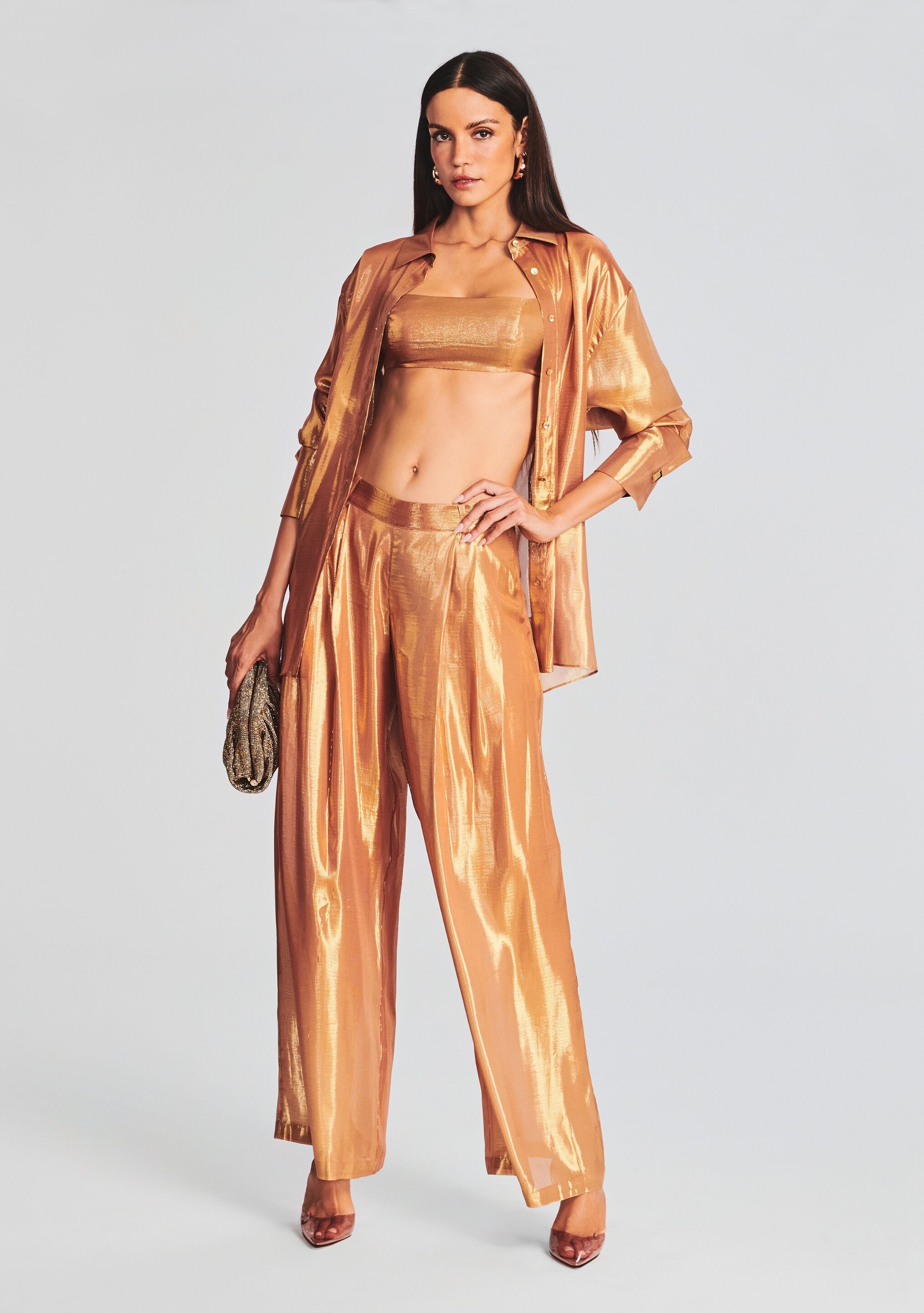 Glisten all night long in our Arista Pant. This silk pant features waist belt loops. back pockets. and is cut in a loose fit. Shown here in Nude Glitter.- 72% Silk. 28% Metallic