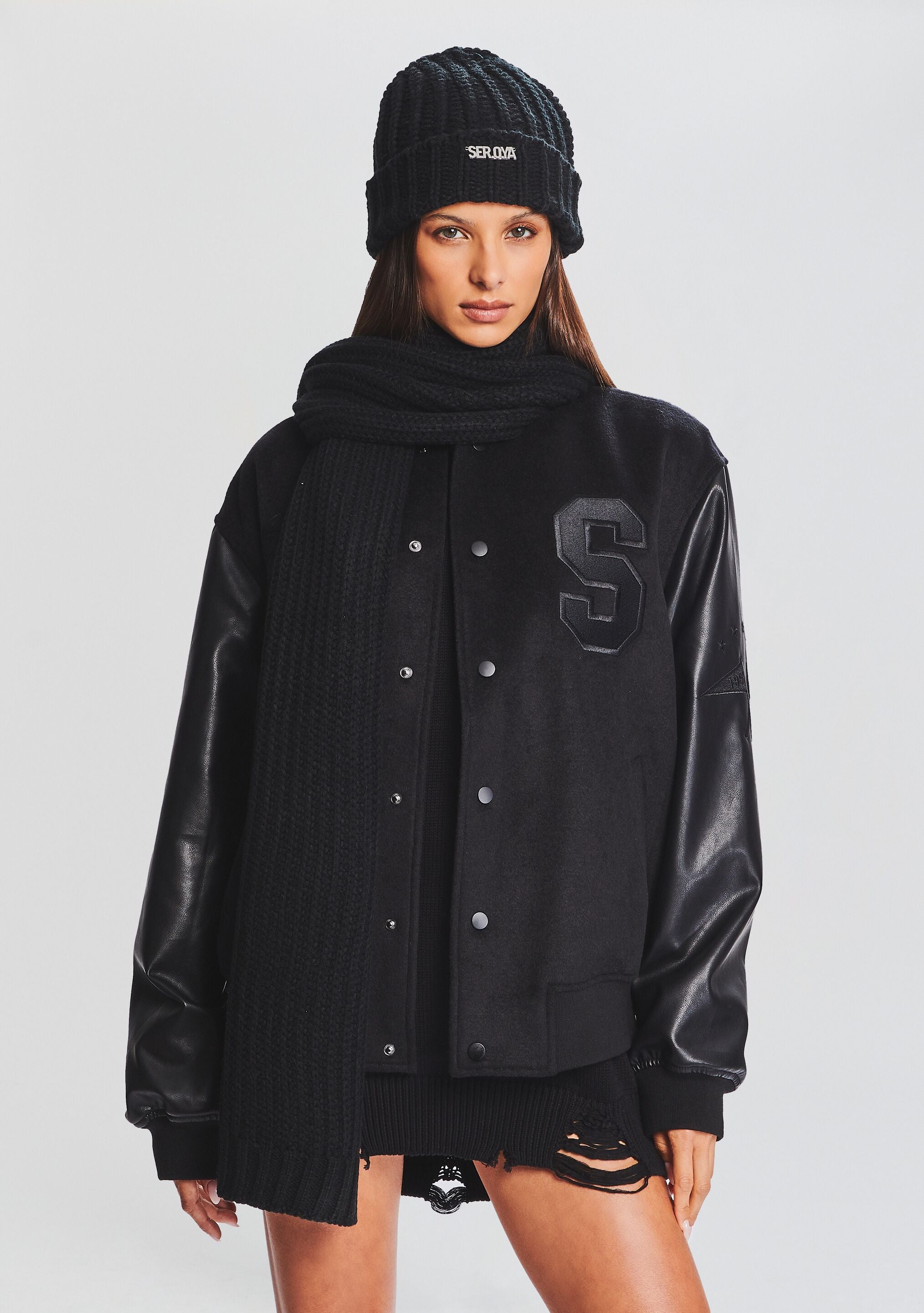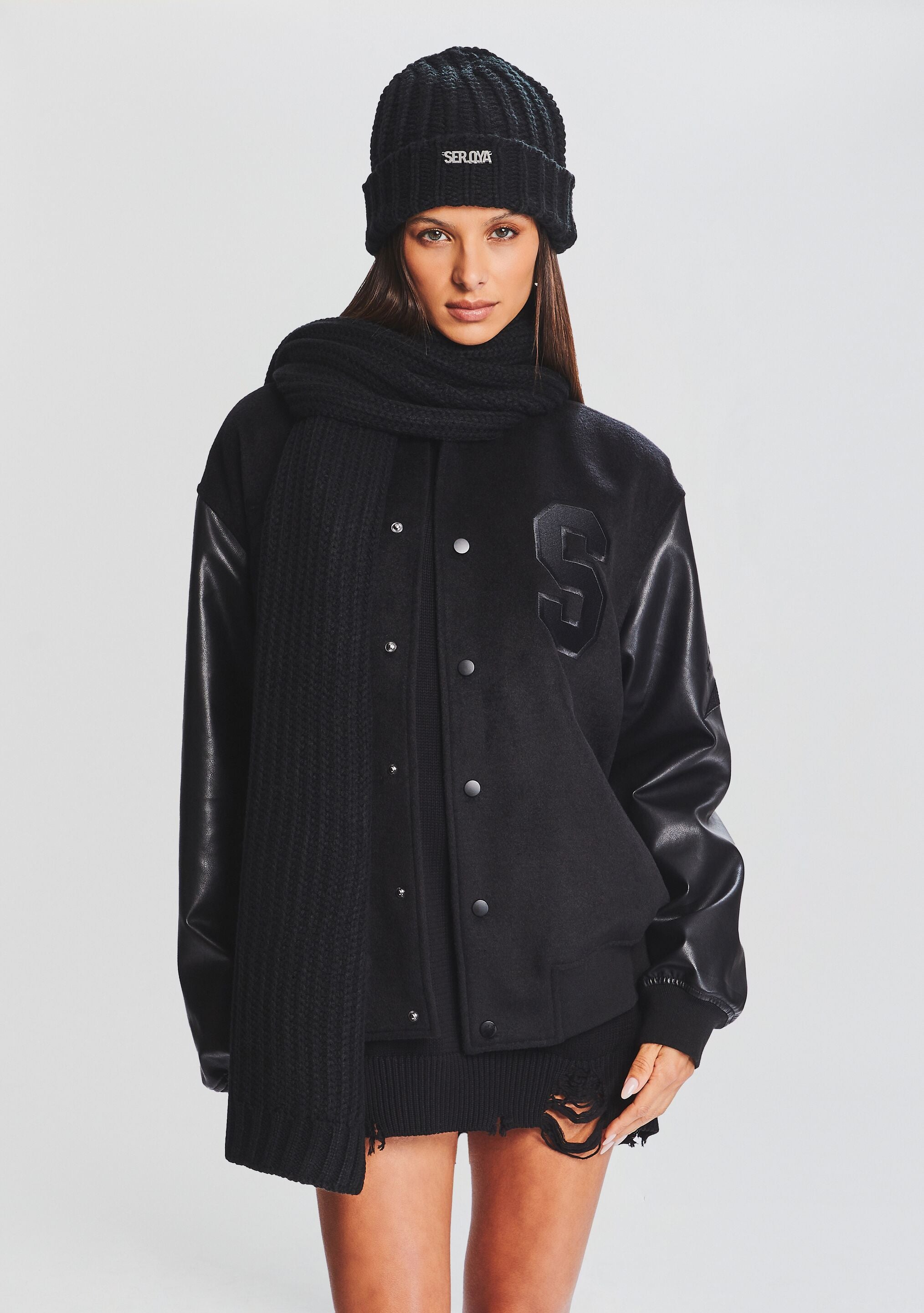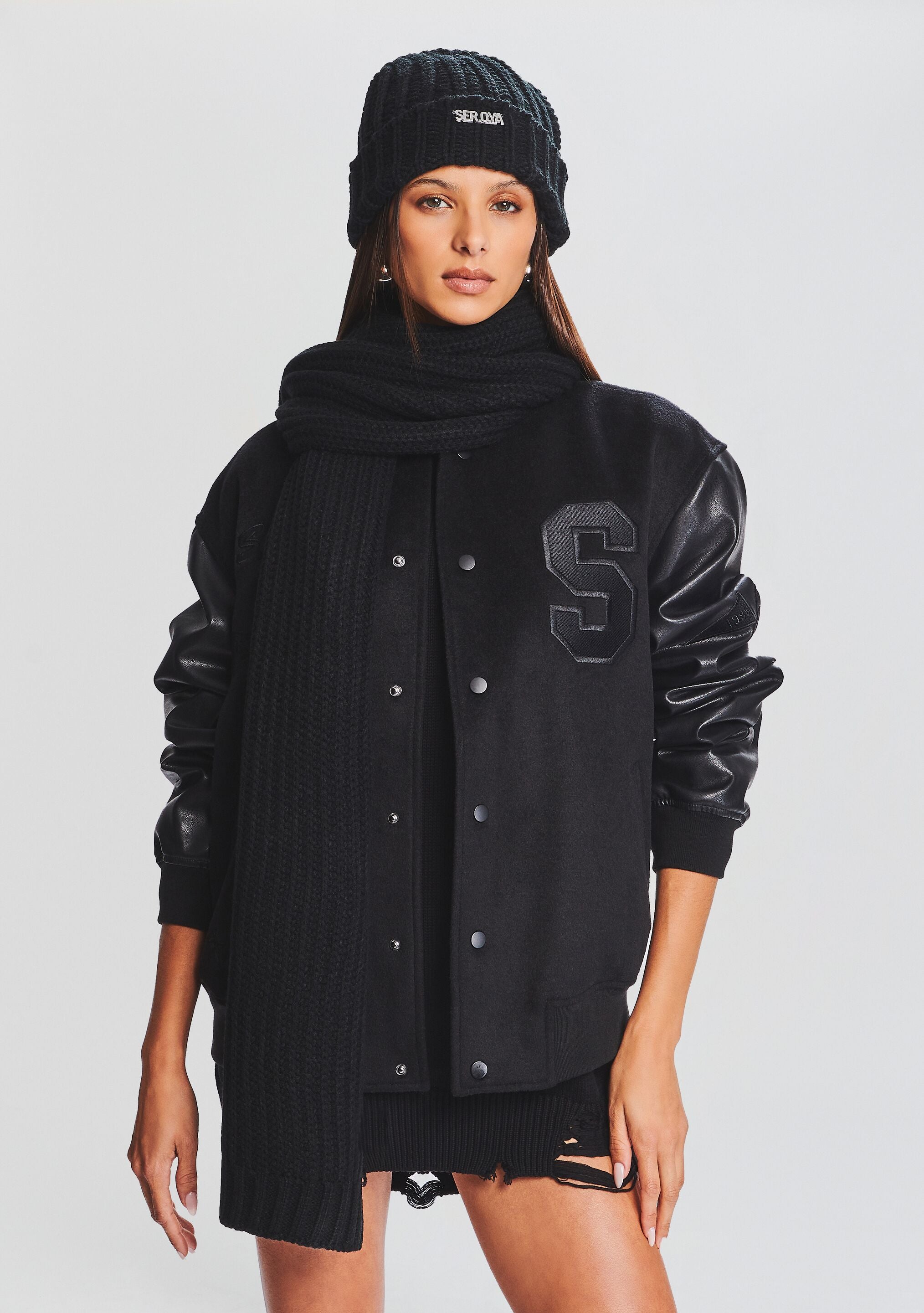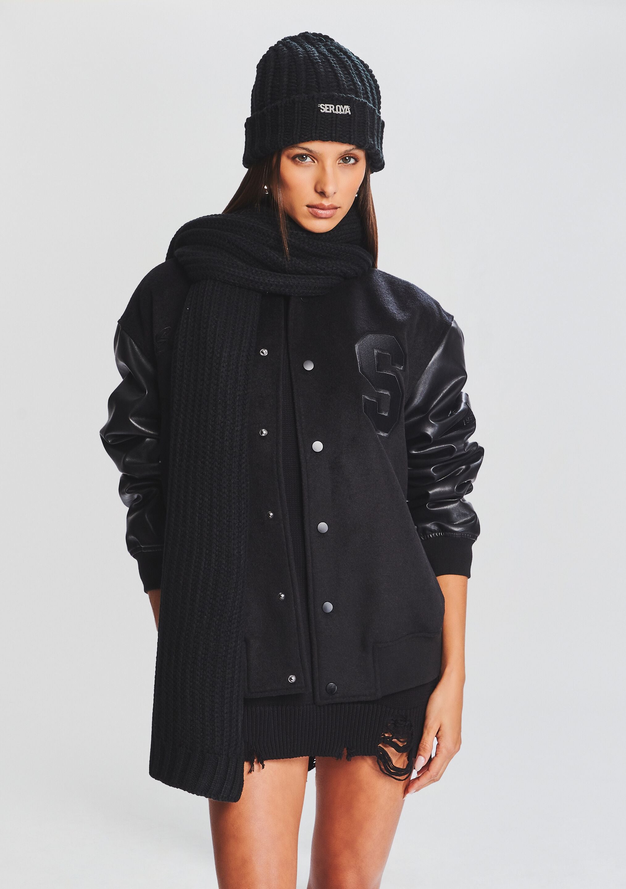 Cozy up with SEROYA's Ash Scarf. Cut in a warm knit. the scarf features a SEROYA emblem stitched on its front. Shown here in Black.