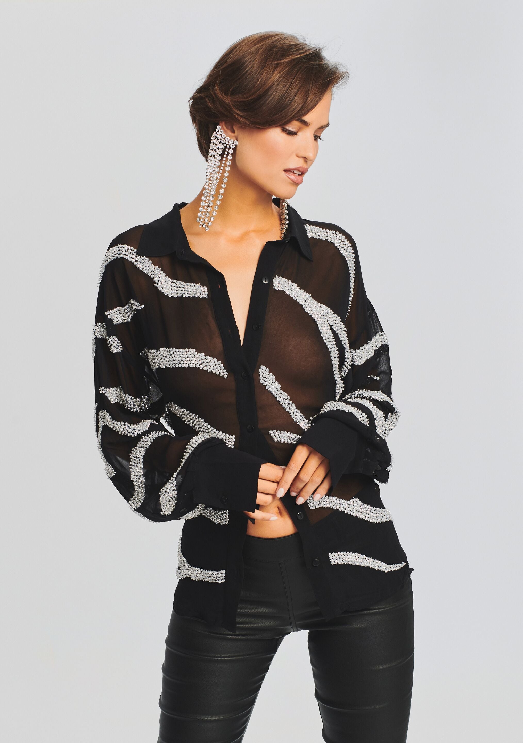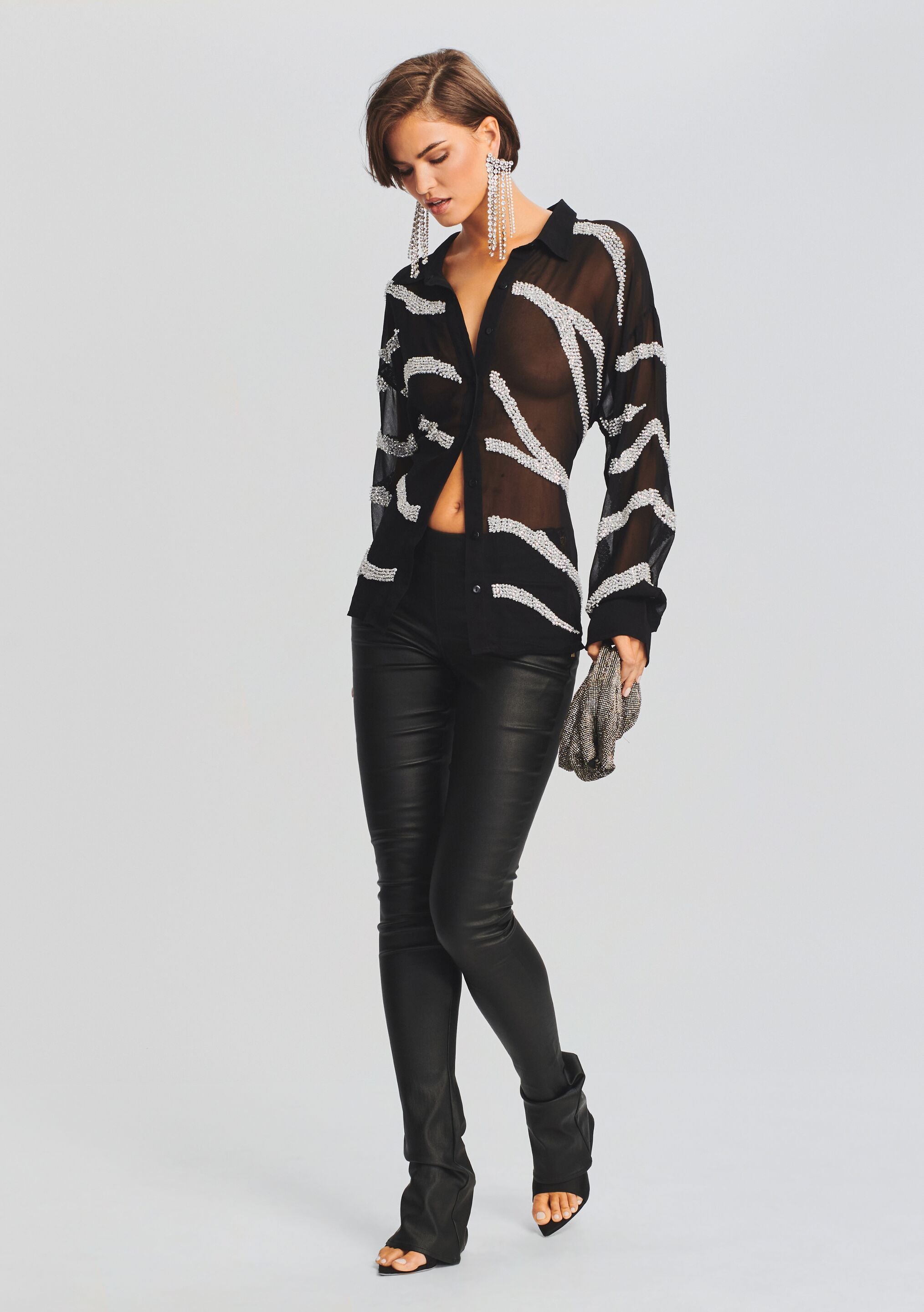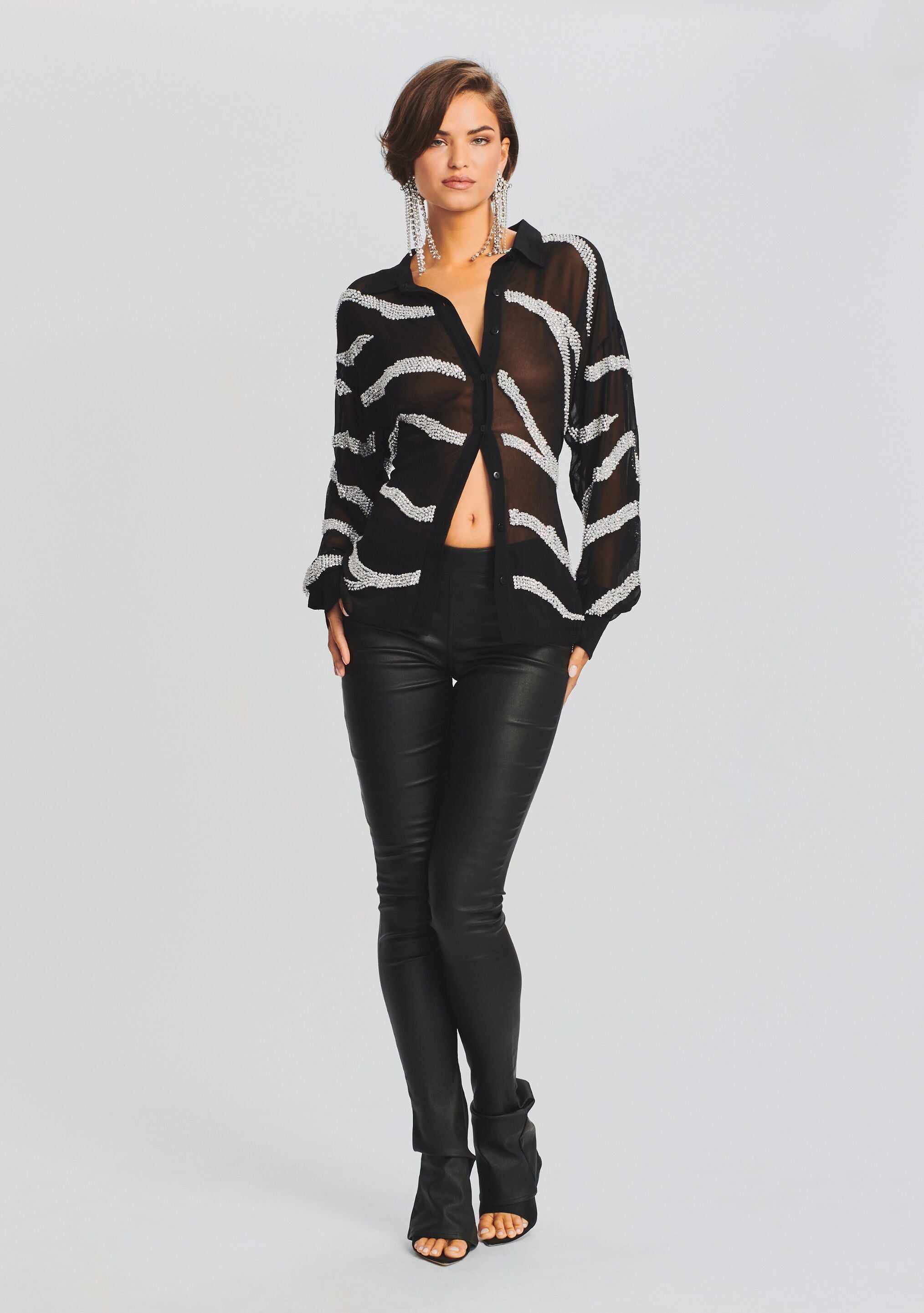 Our Campbell button up features glistening zebra stripes combining the sheerness you desire with a bit of sparkle. Pair it with our coordinating Miranda Pant for a fresh take on animal print. Shown here in Shiny Silver Zebra.