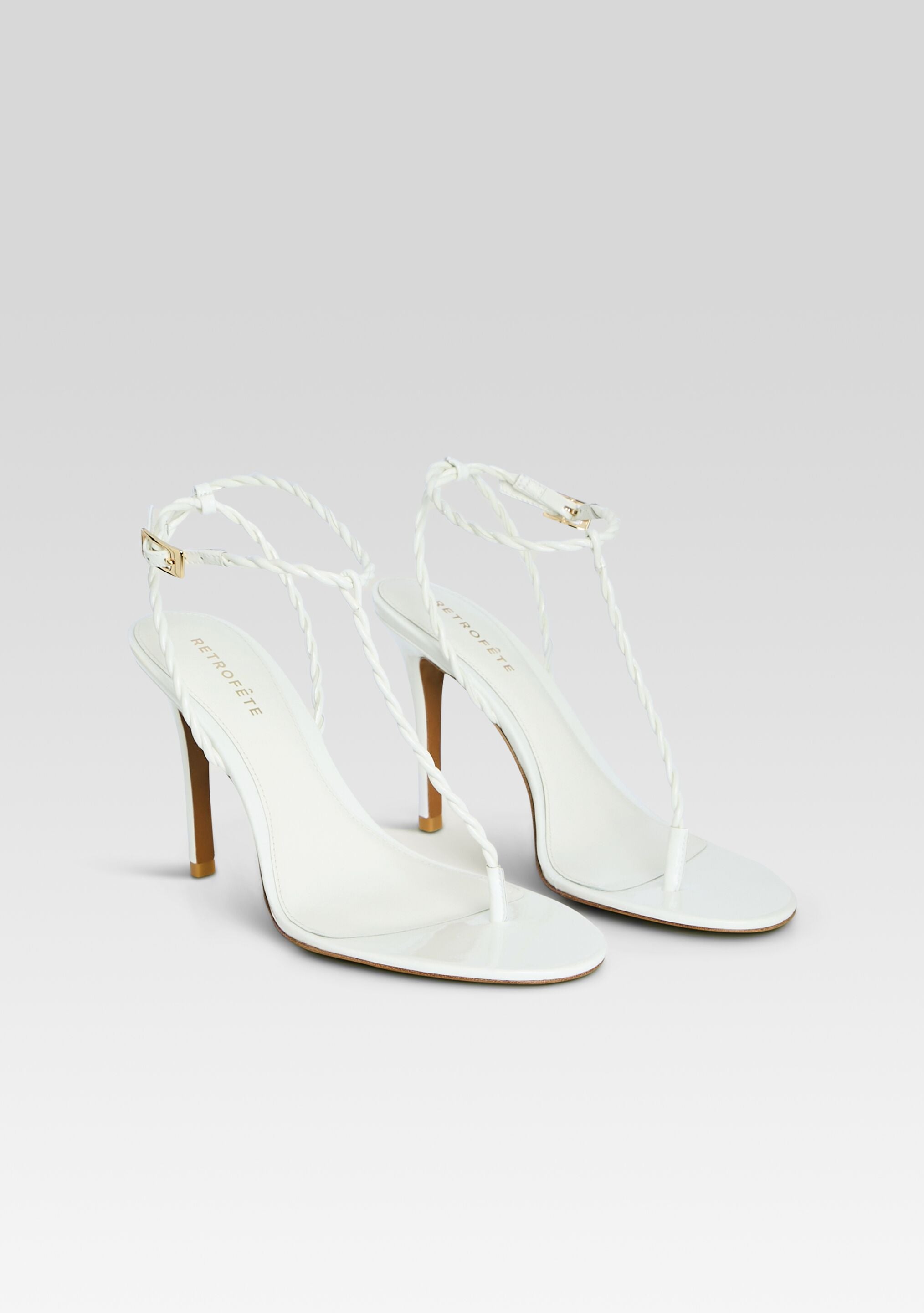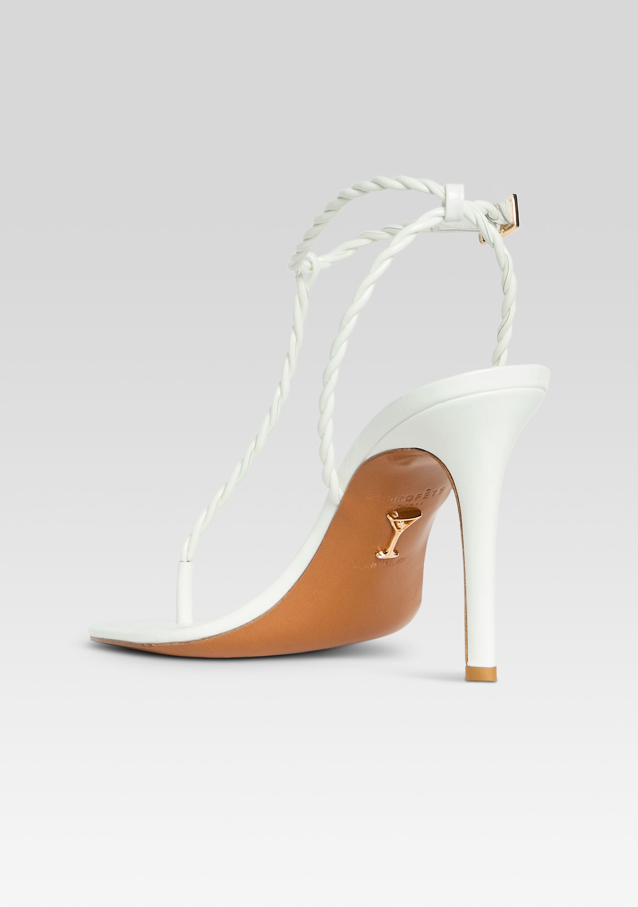 The Cleo Sandal elevates any evening with its twist thong and delicate T-strap design. Ideal for nights out or intimate dinners. this high heel style delivers a sleek. look from cocktails to dessert. Shown here in White.