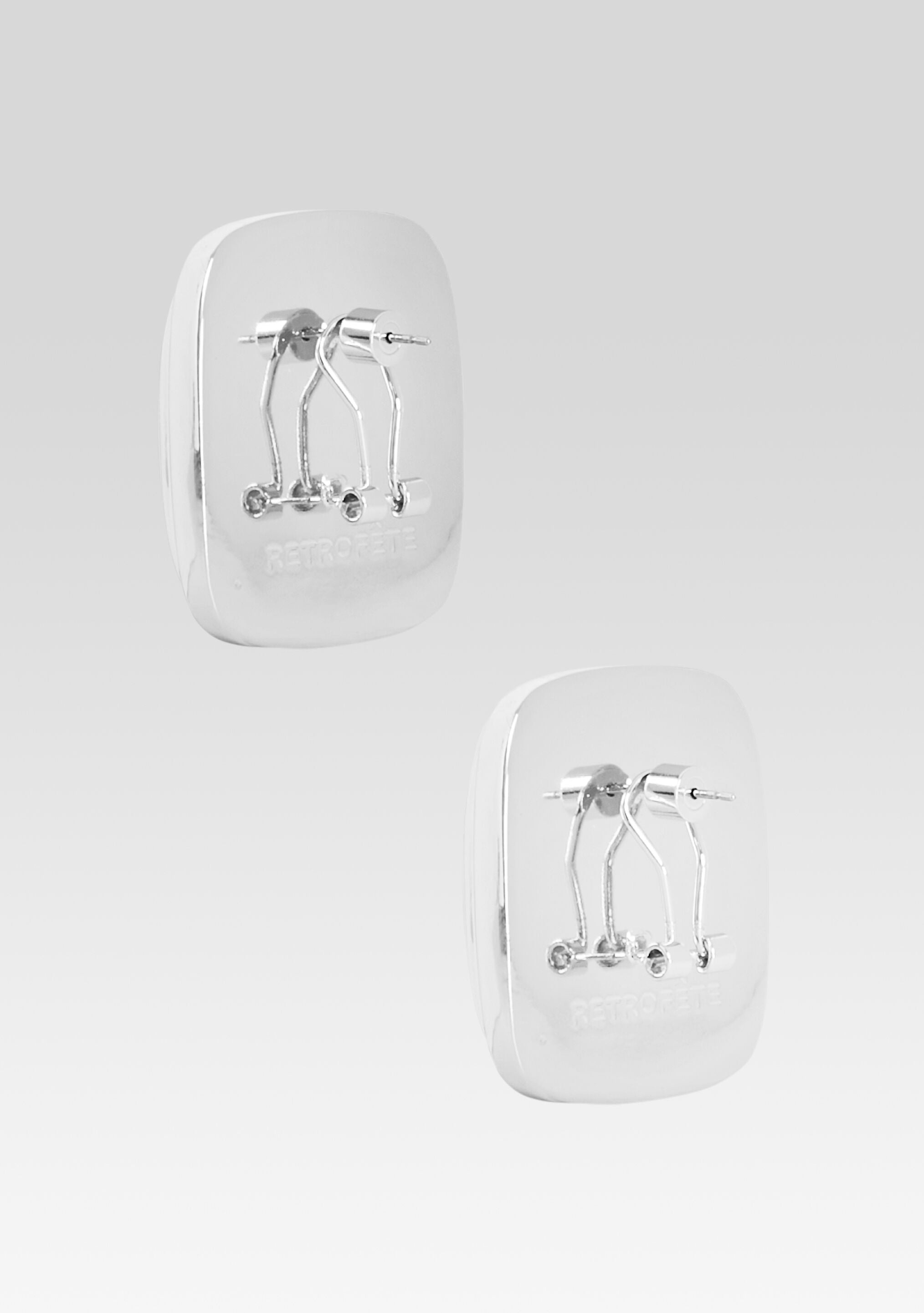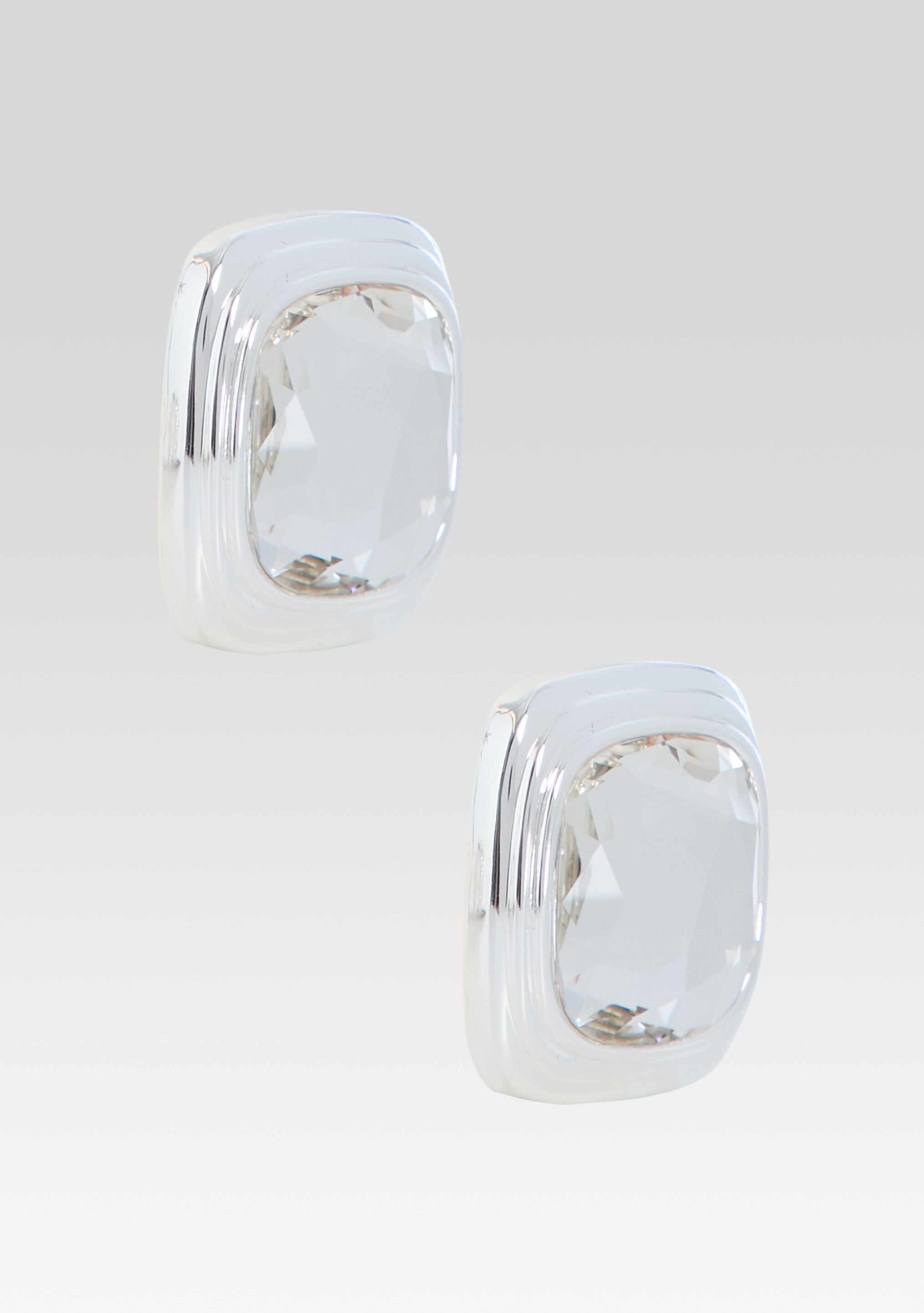The Clive Earring pairs modern design with refined elegance. Featuring a soft square silhouette with a distinctive double lip detail and a luminous glass gemstone center. it catches the light with subtle impact. Finished with a secure omega post back clip closure. this statement style transitions effortlessly from day to evening. Shown here in Silver/Crystal.