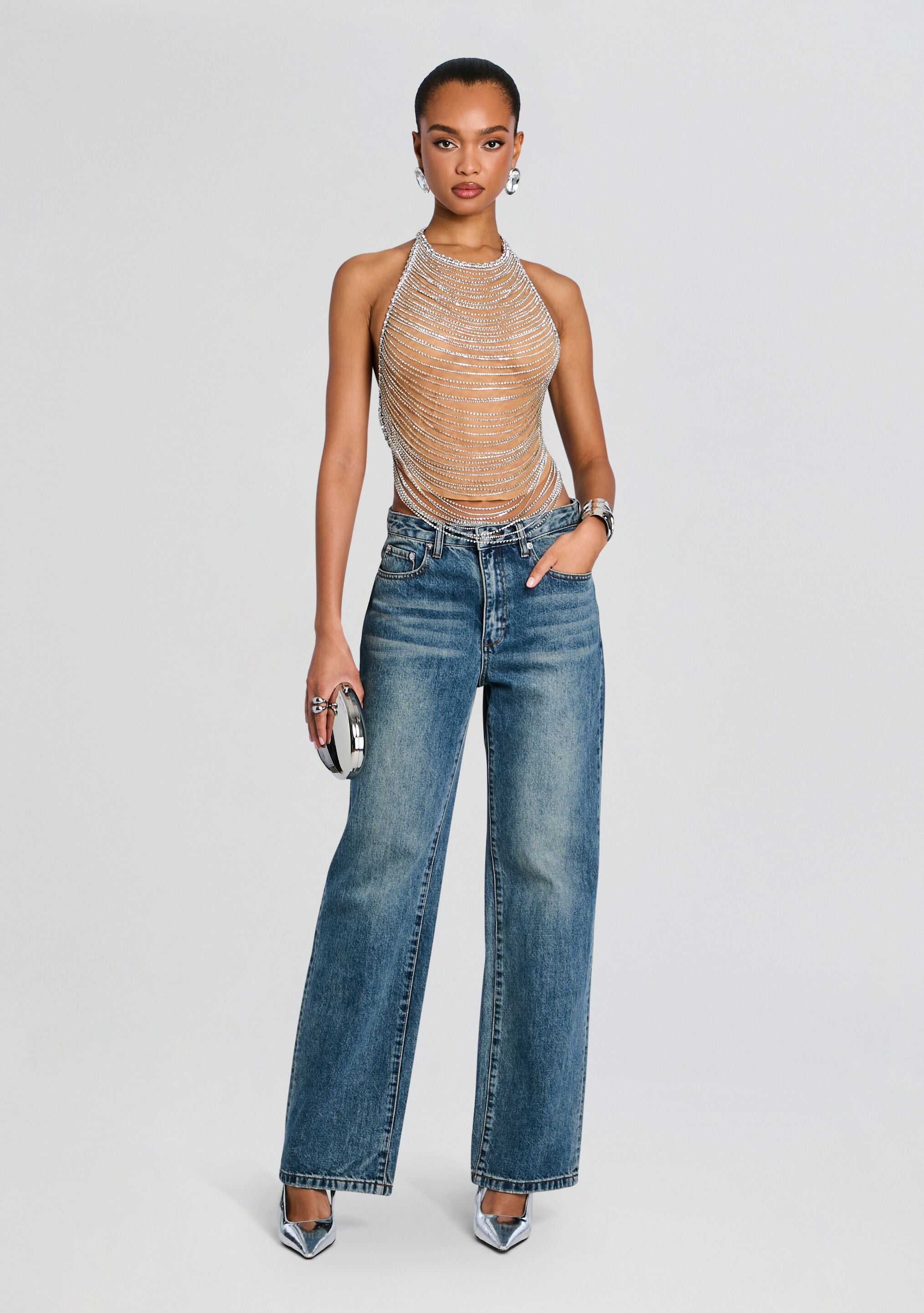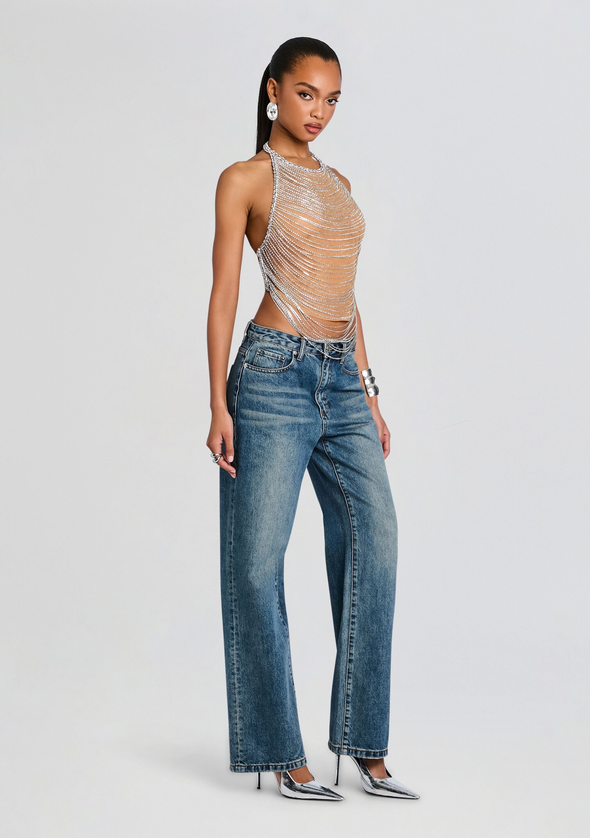 Embrace effortless elegance with our Delaney Top. featuring delicate draping and mesmerizing embellishments. The open back design adds a contemporary twist. making this top perfect for a night out or a special occasion. Let your style shine through with this ethereal and chic ensemble. Shown here in Tannin/Silver.