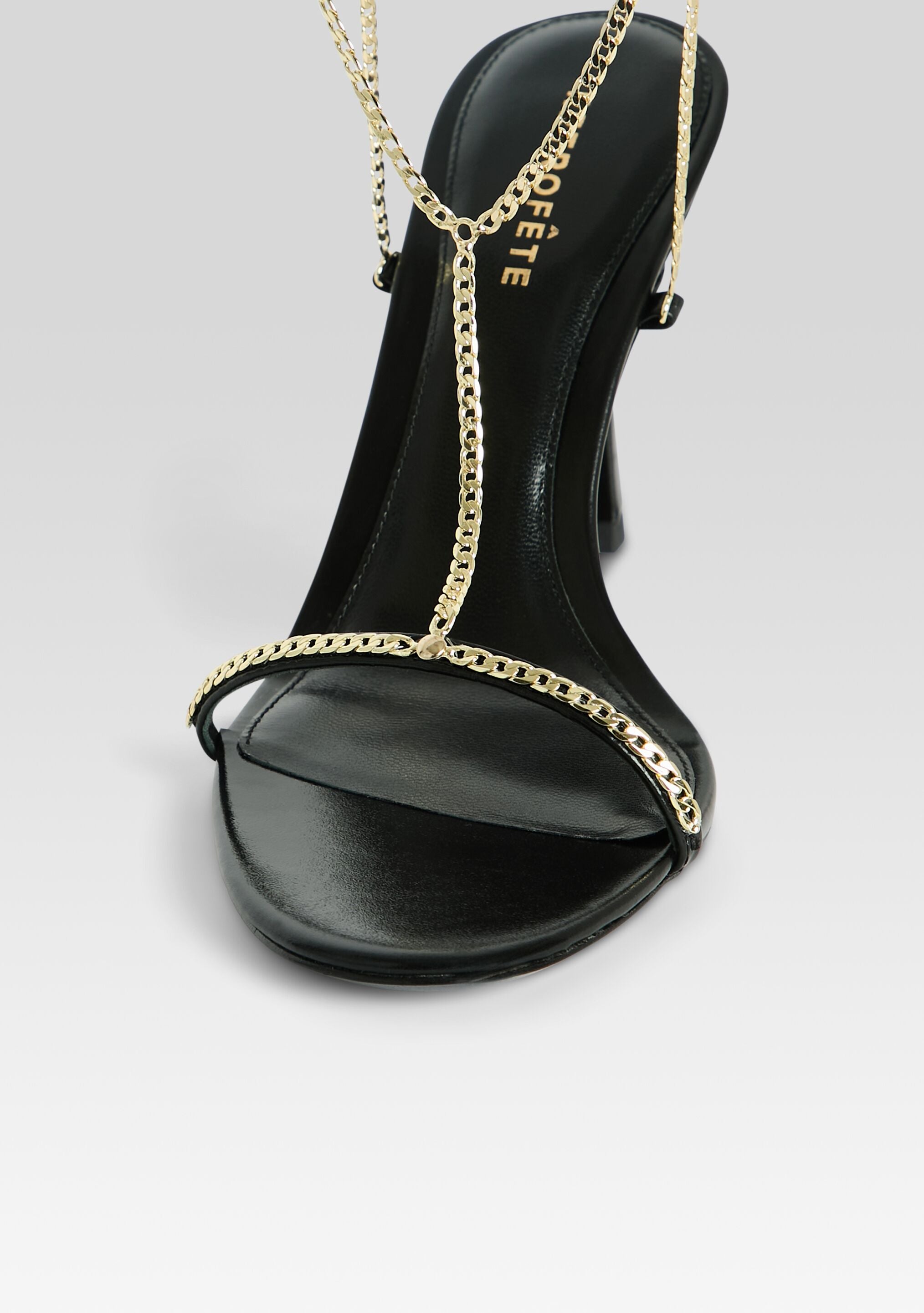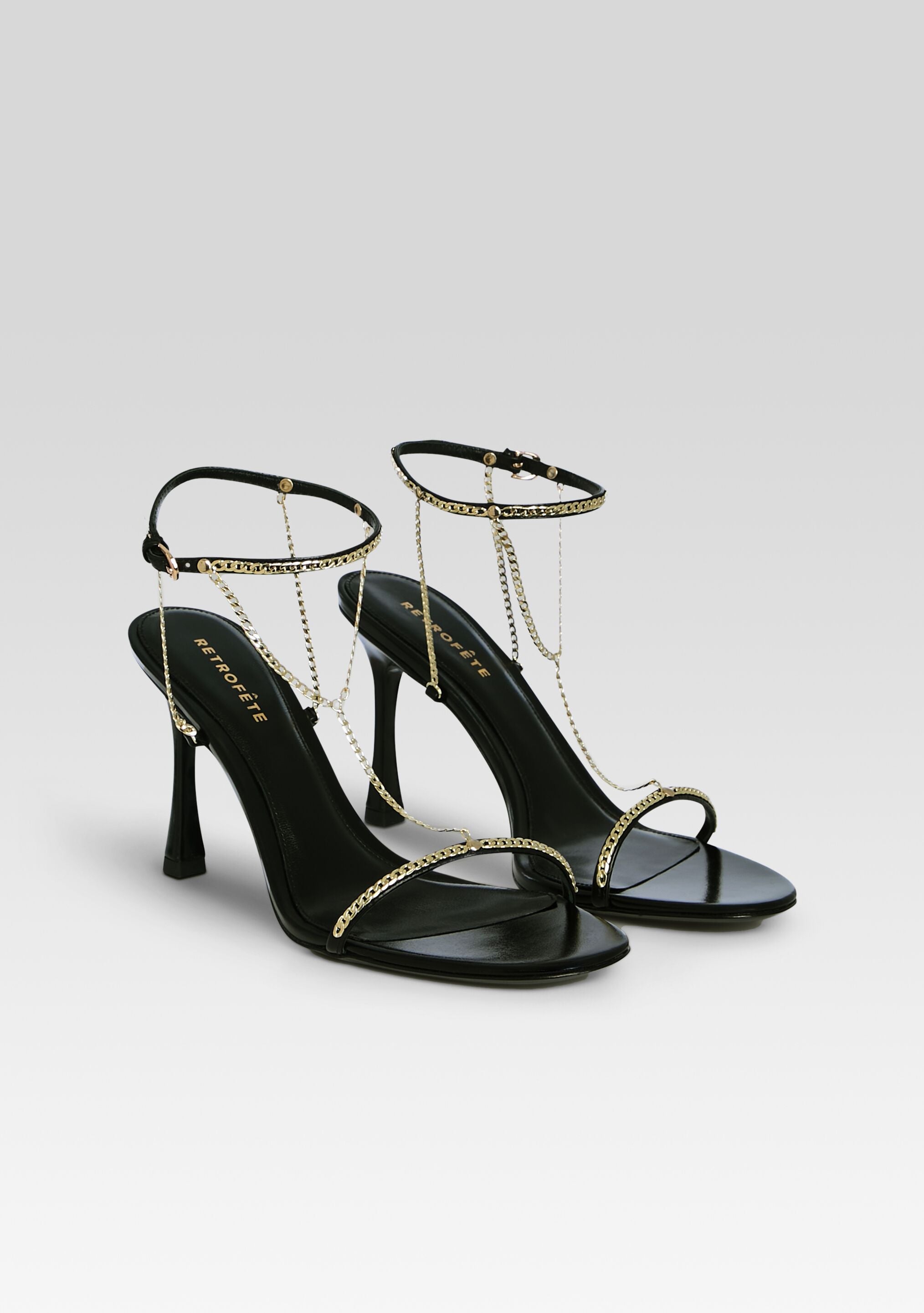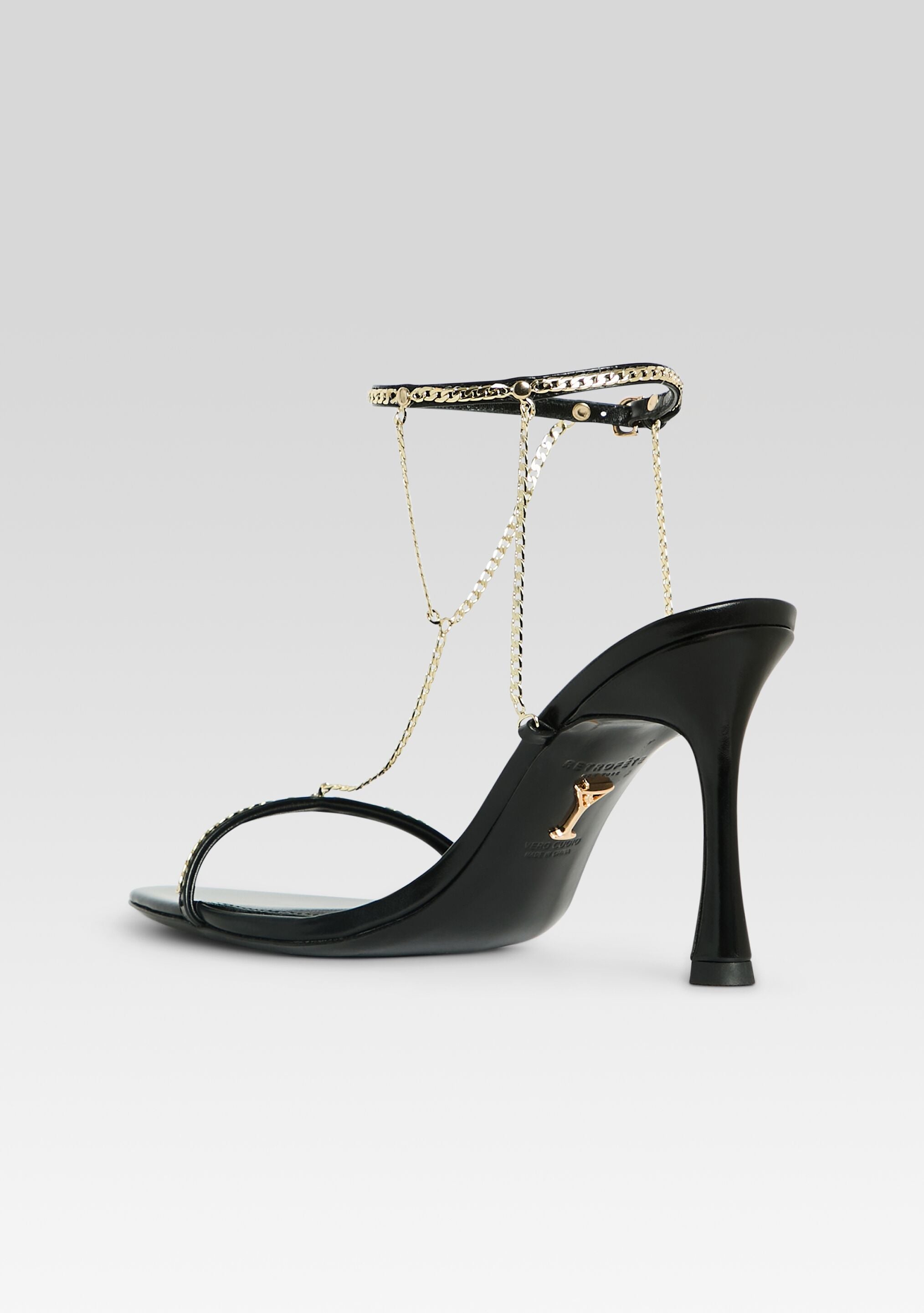The Finny Sandal elevates any evening with its sleek. strappy silhouette and striking T-chain detail. Ideal for girls' nights out and special occasions. it offers a modern. unique look. Shown here in Black.