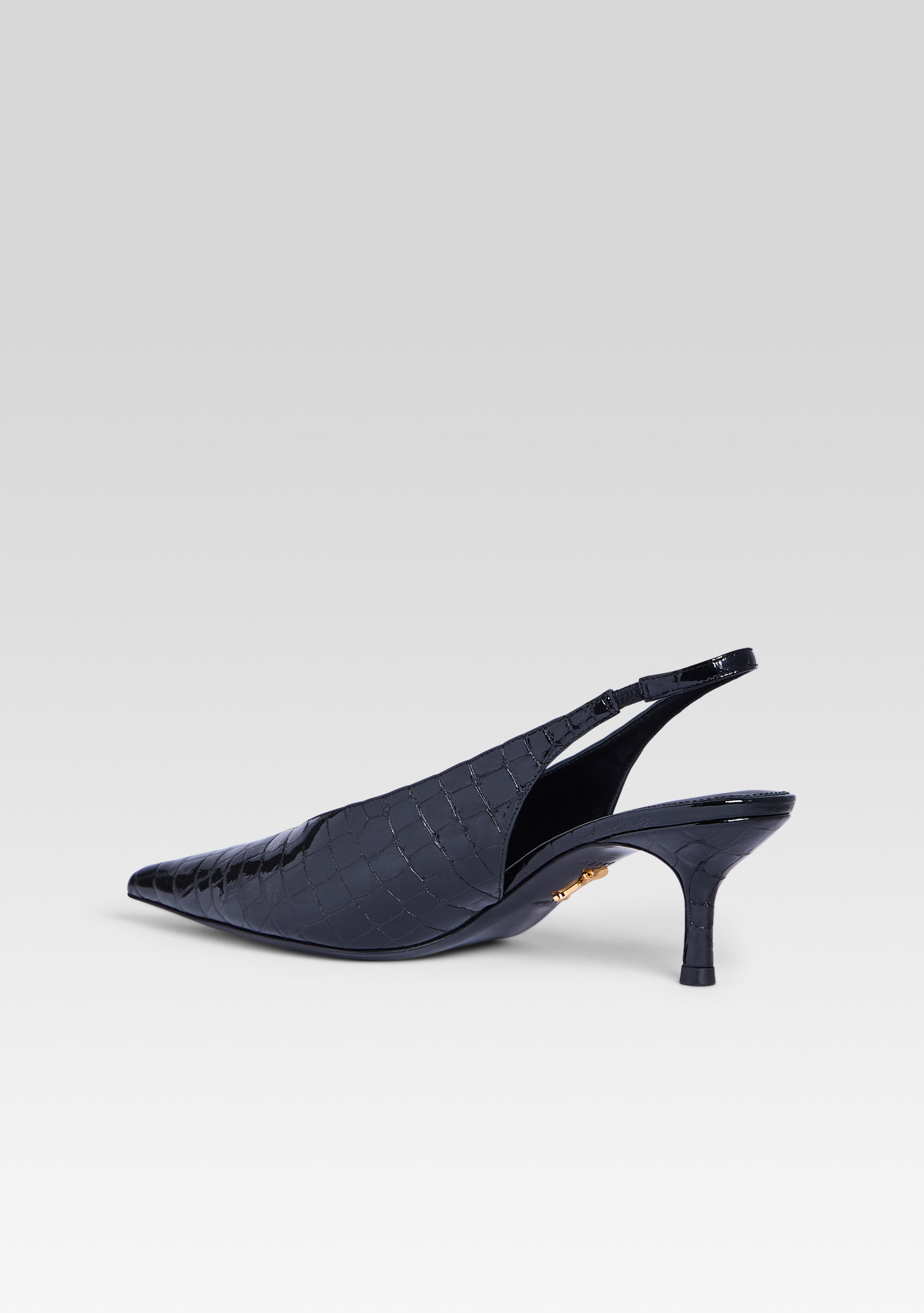 Crafted from supple leather. the Isobel Slingback features a pointed-toe design with a secure slingback strap for a confident fit. Its closed-toe silhouette adds polished sophistication. making it perfect for both daytime and evening occasions. Shown here in Black Croco.