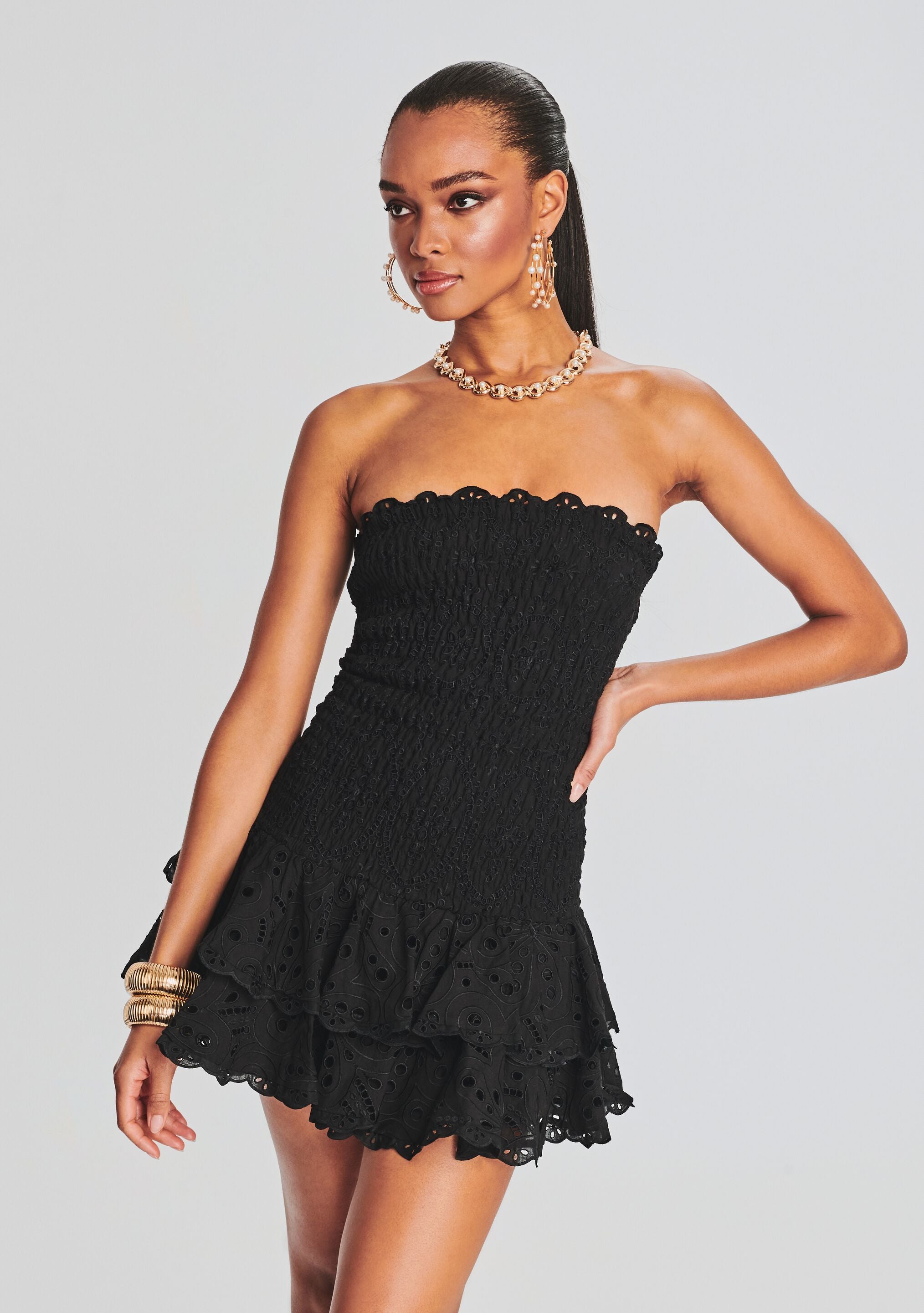 The Megan mini dress. made from broderie anglaise cotton blend. is equal parts effortless and versatile. This strapless silhouette features a shirred bodice for a flexible. form-flattering fit. and a romantic. tiered skirt with lace trim. Shown here in Black Fruition.